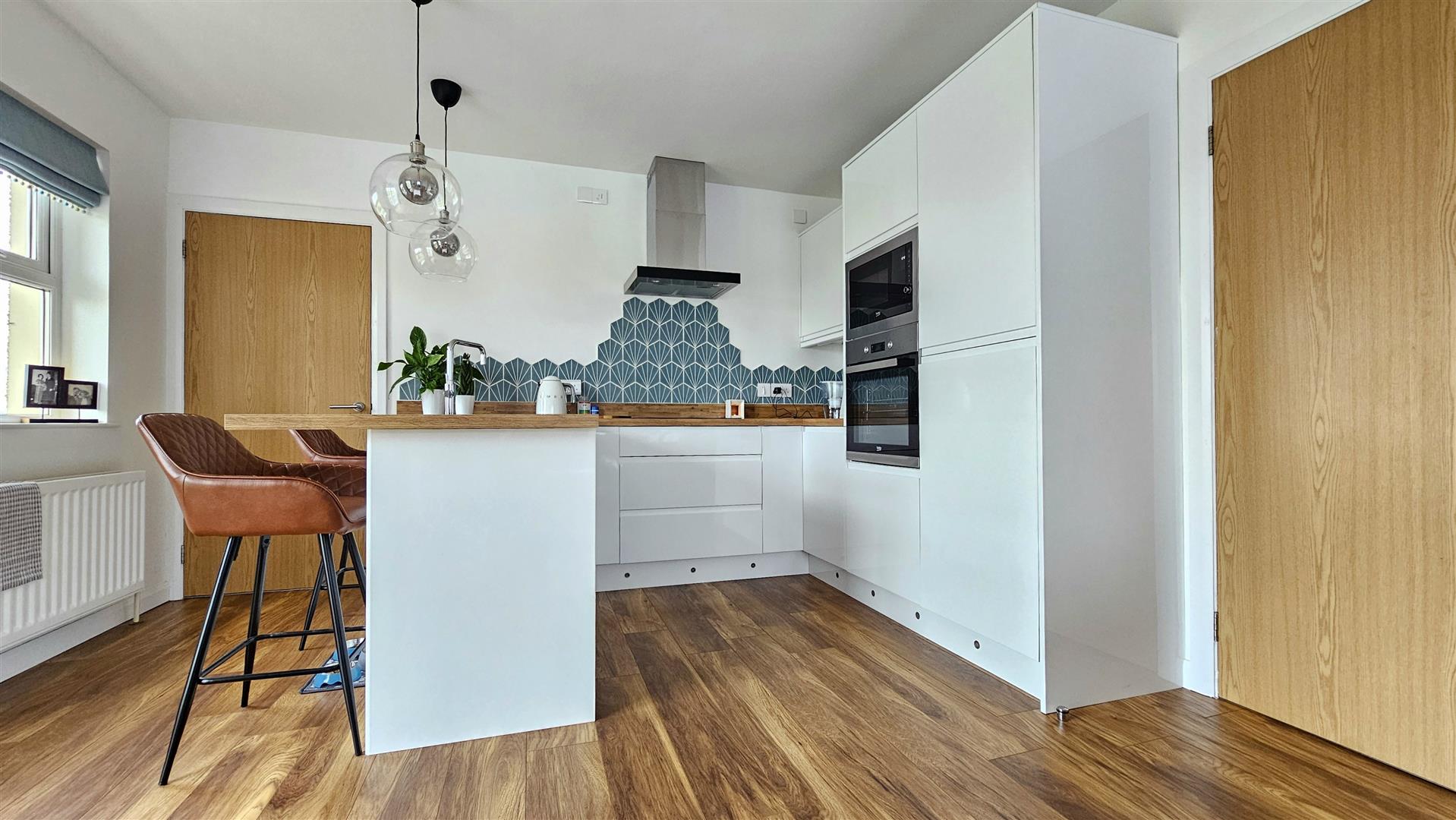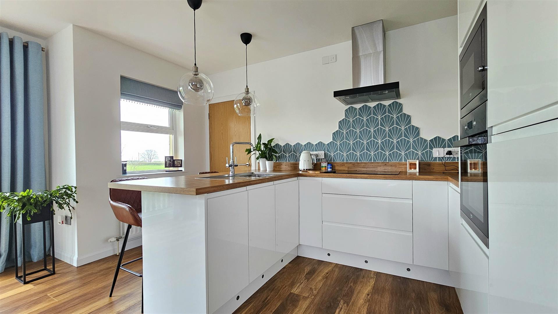 Range of high & low level contemporary white handless units with wood effect worktops & matching upstand, breakfast bar, inset stainless steel sink & drainer with mixer tap over, built in stainless steel over, microwave, 4 ring hob, stainless steel chimney style extractor, integrated fridge & freezer, feature floor level lighting, laminate wood floor