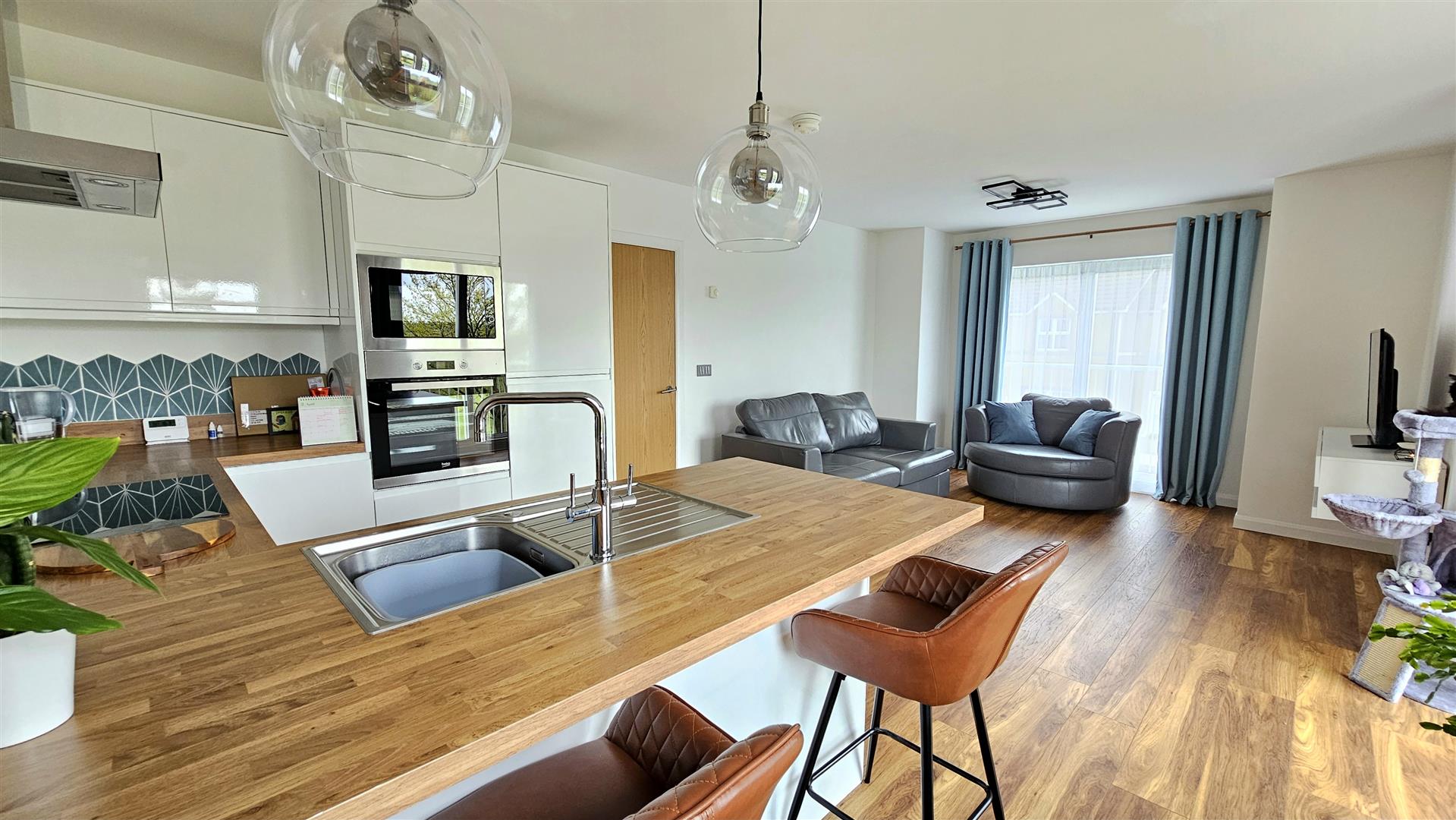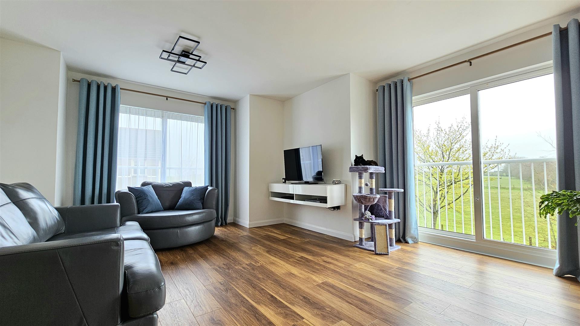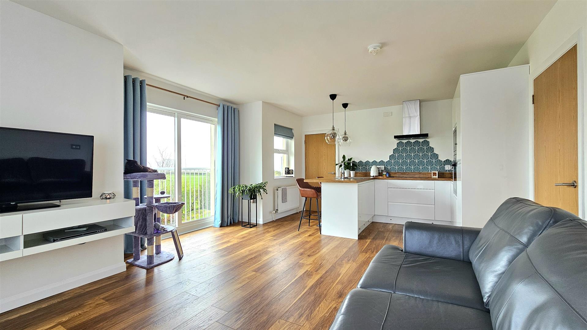 The property comprises two bedrooms, including a master with fitted mirrored slide robes, and centres around a spacious 21'10 lounge which flows seamlessly into a contemporary kitchen, creating an open and practical living environment. The lounge is enhanced by two sets of sliding doors opening to Juliet-style balconies, allowing for excellent natural light and taking full advantage of views across open farmland. The kitchen is fitted with modern white handleless units, a breakfast bar and a range of built-in appliances including a stainless steel oven, microwave, chimney style extractor and fridge freezer, while the bathroom is finished with a white suite, complemented by a contemporary black framed shower screen and matching drencher shower.