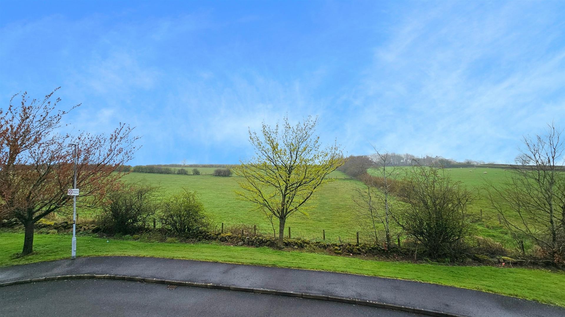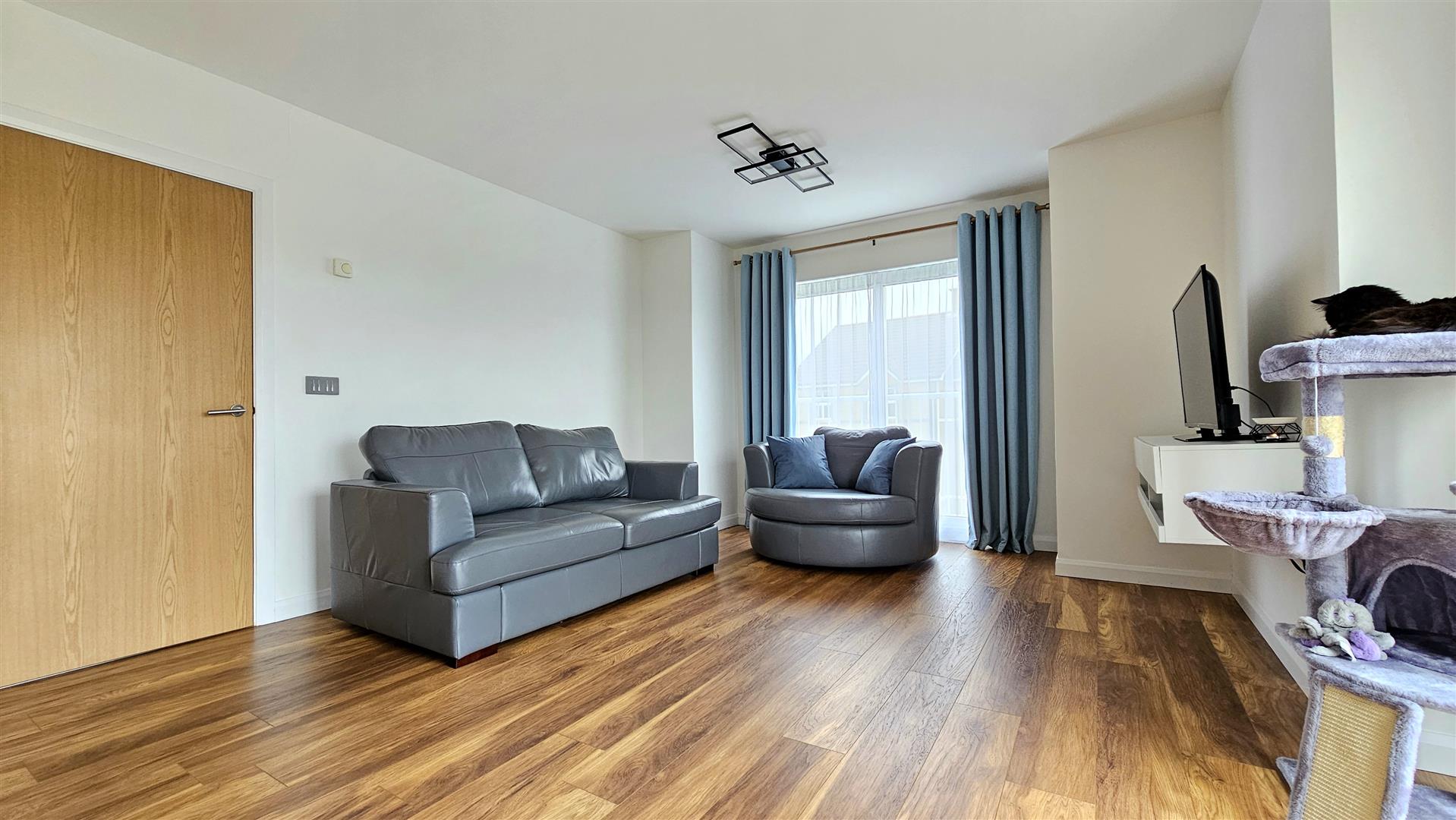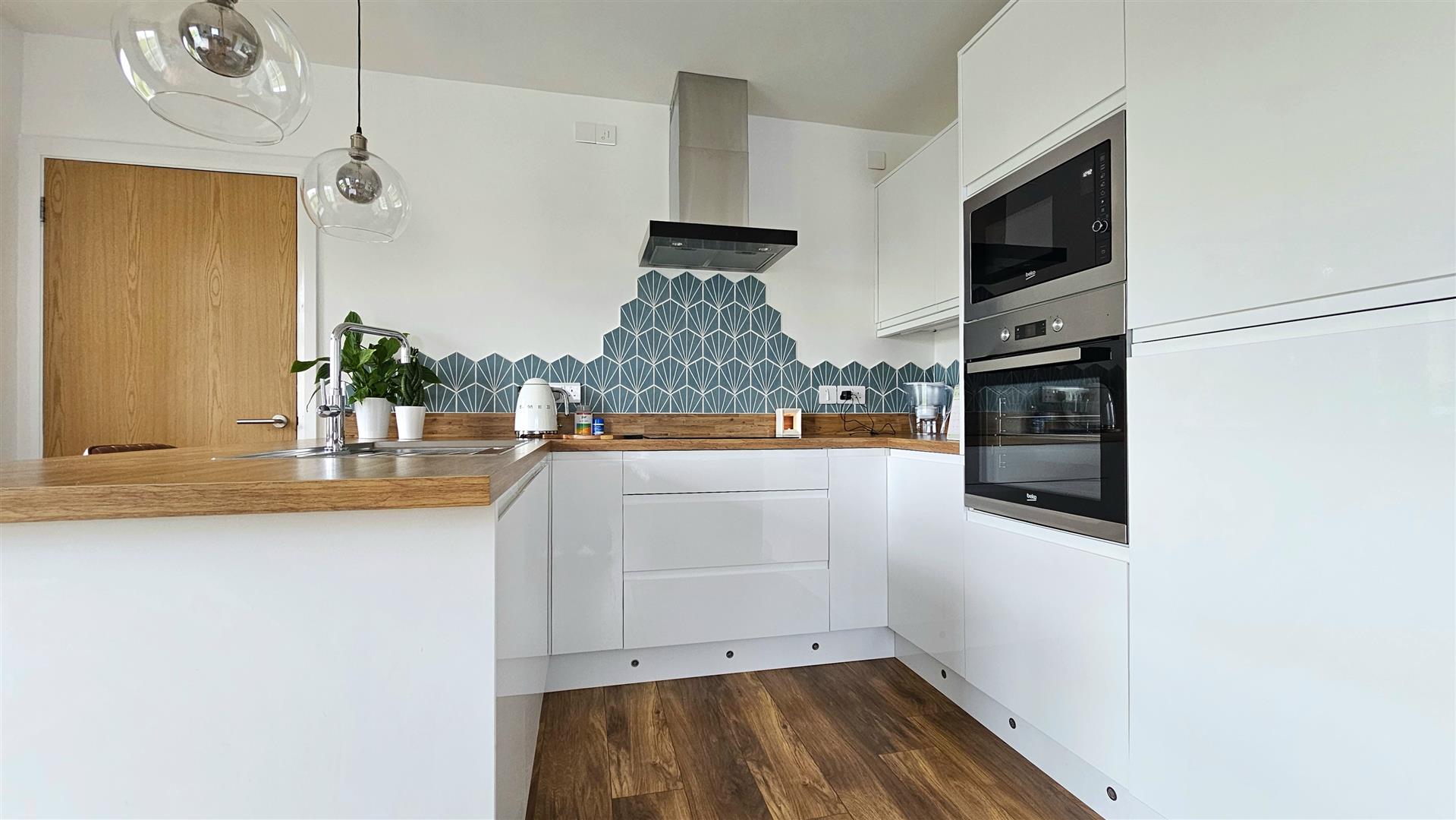 The property comprises two bedrooms, including a master with fitted mirrored slide robes, and centres around a spacious 21'10 lounge which flows seamlessly into a contemporary kitchen, creating an open and practical living environment. The lounge is enhanced by two sets of sliding doors opening to Juliet-style balconies, allowing for excellent natural light and taking full advantage of views across open farmland. The kitchen is fitted with modern white handleless units, a breakfast bar and a range of built-in appliances including a stainless steel oven, microwave, chimney style extractor and fridge freezer, while the bathroom is finished with a white suite, complemented by a contemporary black framed shower screen and matching drencher shower.