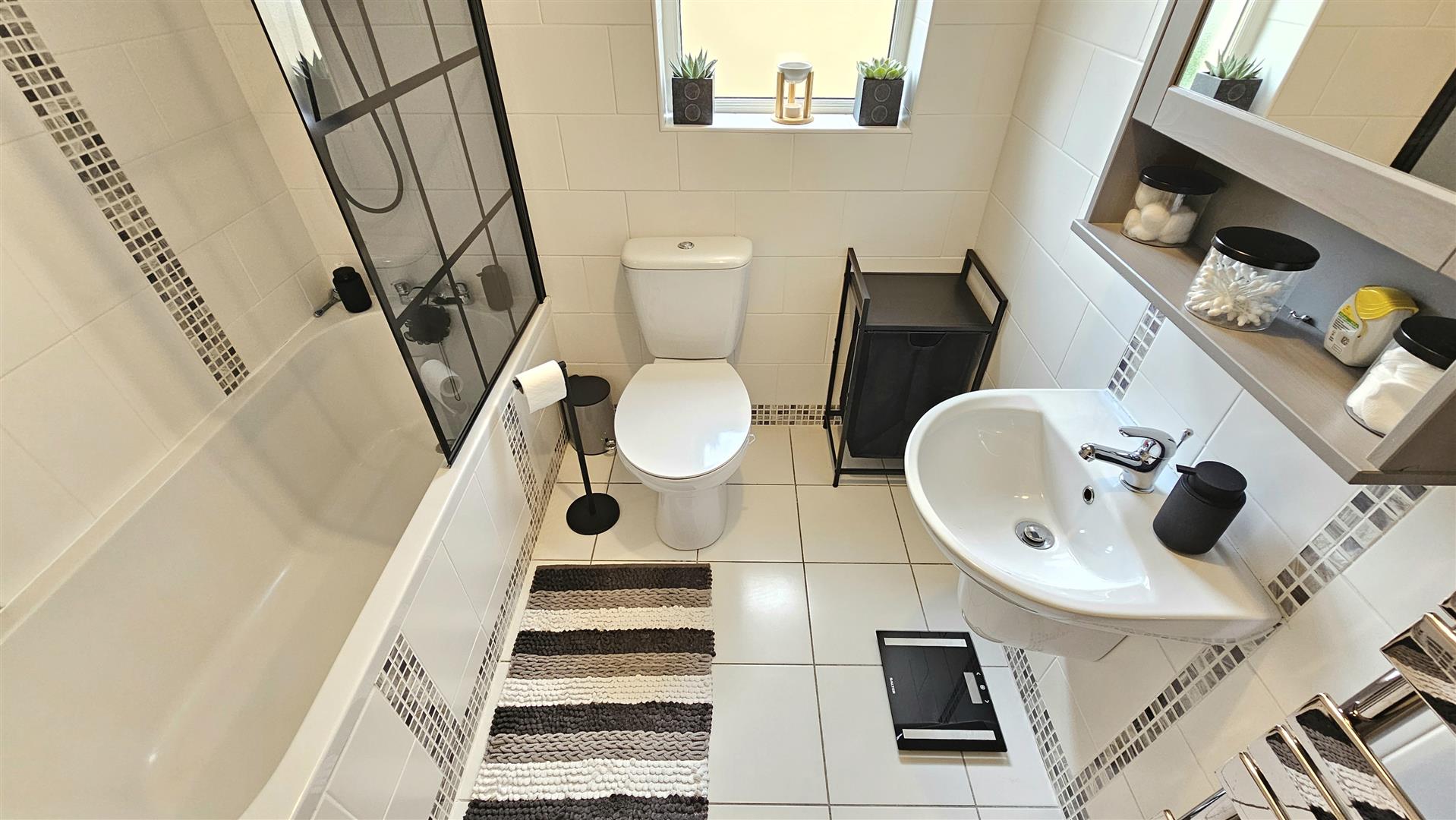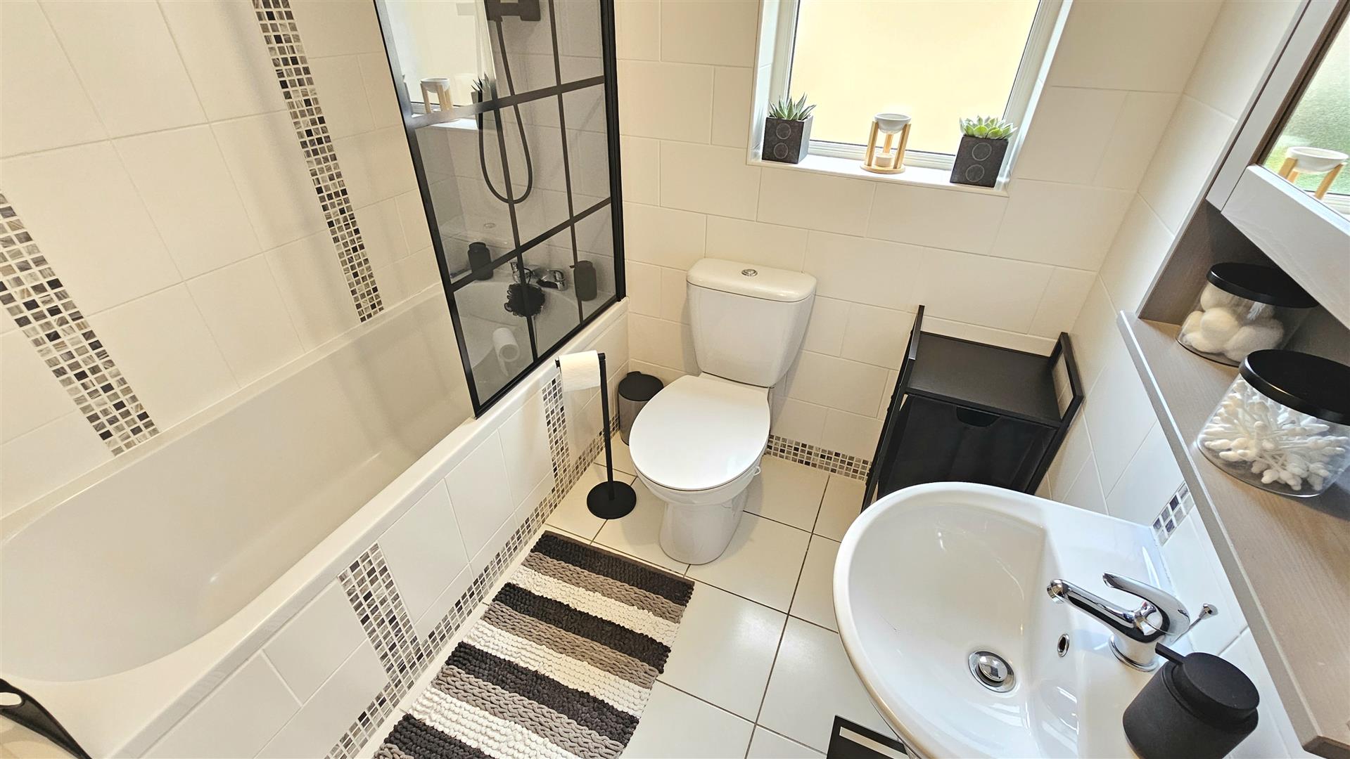 Double glazed window to rear aspect, white suite comprising low flush Wc, floating sink, enclosed bath with contemporary black framed shower screen & matching drencher shower, chrome heated towel reel, fully tiled walls & floor