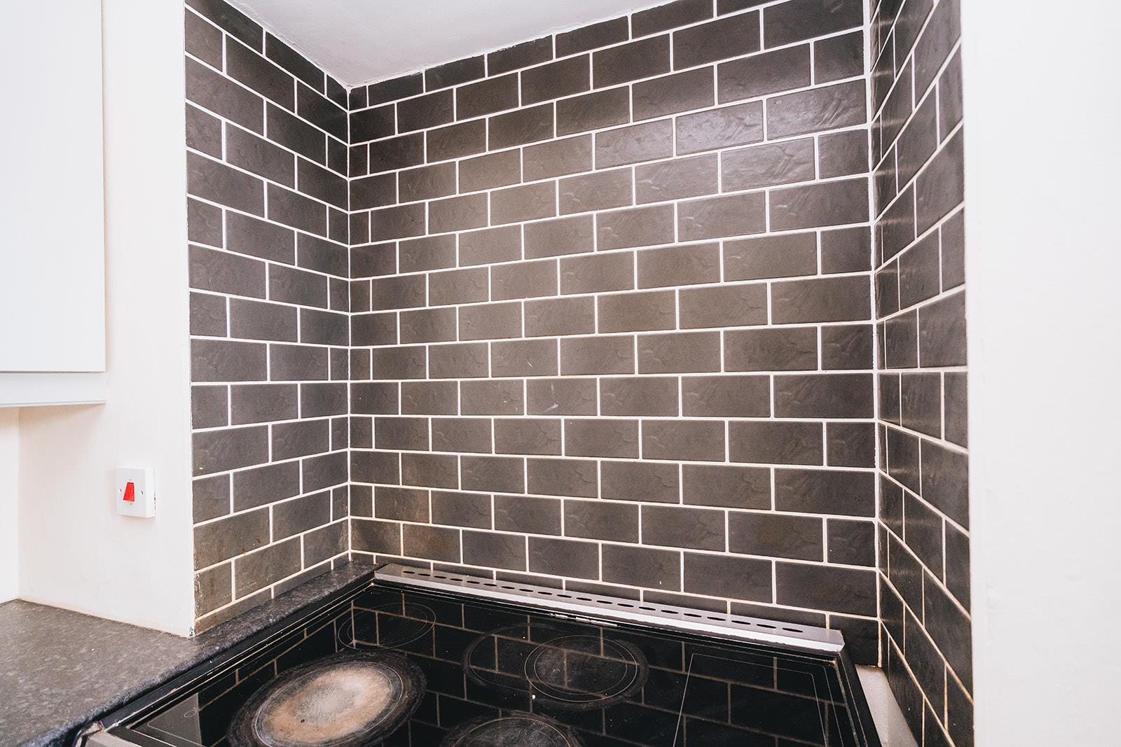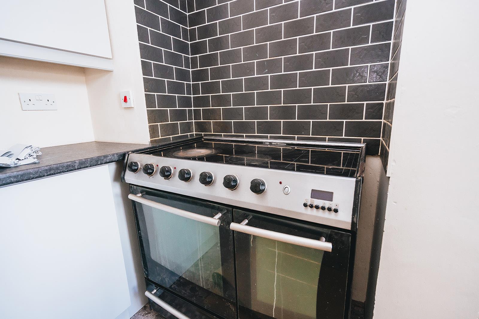 Comprising a range of high and low level units, laminated worksurface incorporating stainless steel sink inset, freestanding stove, strip lighting and plumbed for dishwasher.