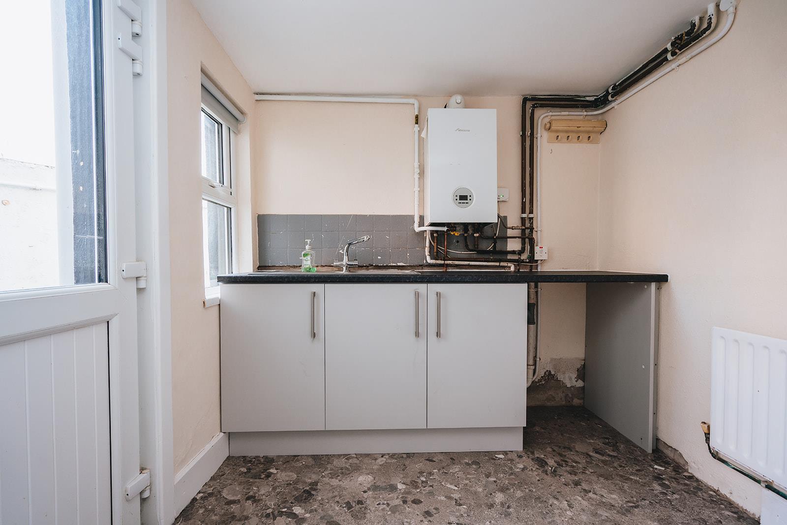 Comprising low level storage which is tiled above, laminated worksurface with stainless steel sink inset, gas boiler, separate storage understairs and uPVC double glazed door to rear.