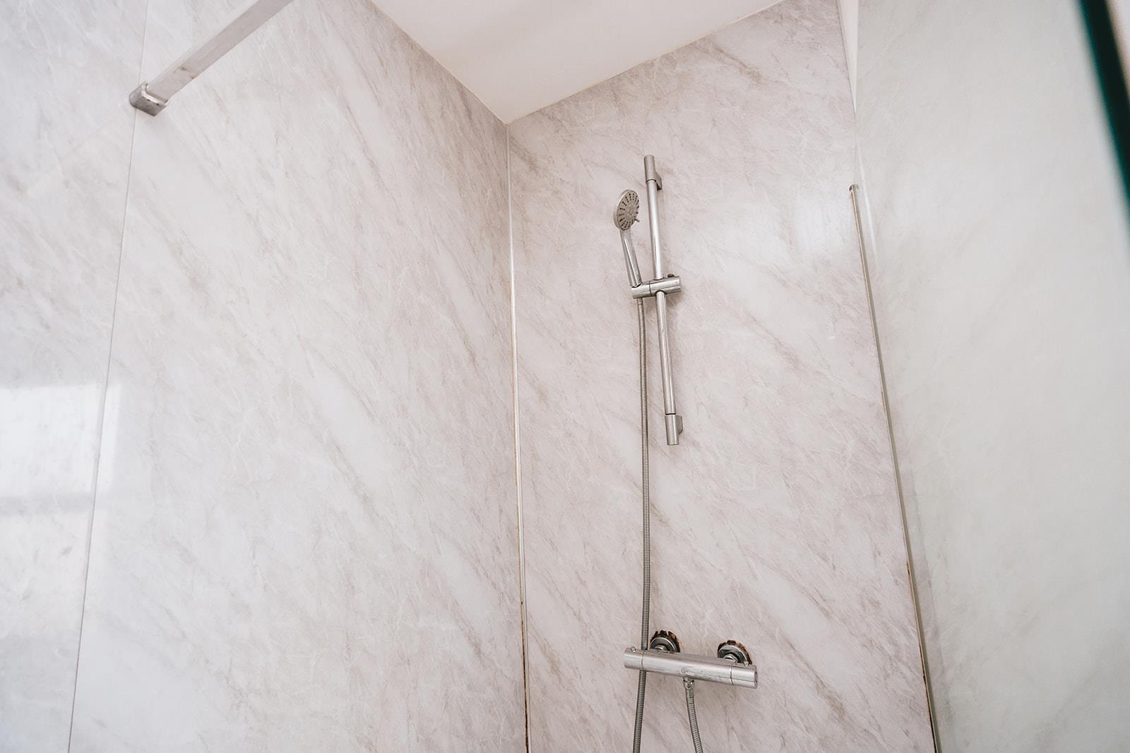 A spacious shower room comprising double walk-in shower with thermostatic shower, low flush wc, tiled floor, pedestal wash hand basin, part acrylic panelled walls.