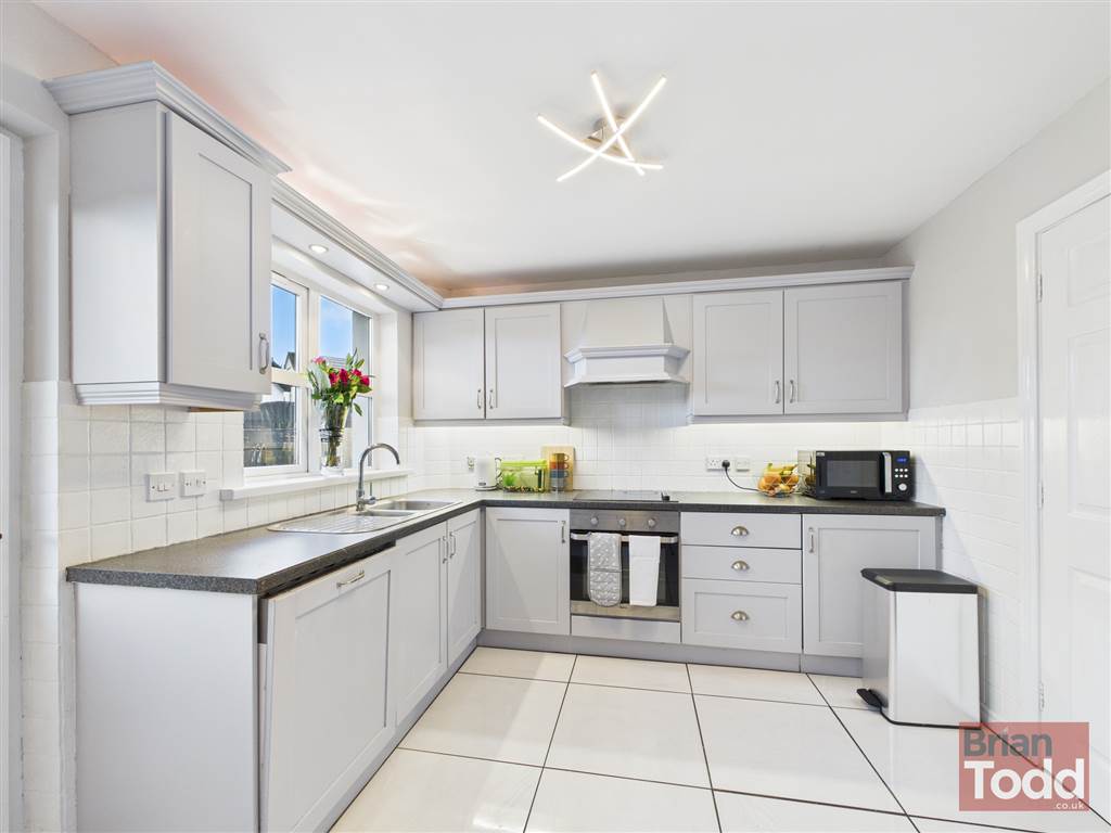 Modern range of fitted upper and lower level units. Integrated electric hob, oven andextractor fan. One and a half bowled stainless steel sink unit. Floor tiling. Part wall tiling.