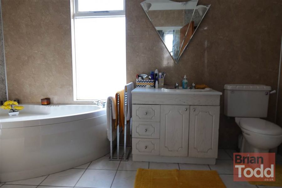 White suite incorporating corner bath, vanity wash hand basin and W.C. Separate shower cubicle with electric shower. Heated towel rail. Decorative PVC panelling to walls. Floor tiling.