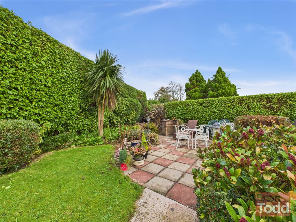 PRIVATE REAR GARDEN LAID TO LAWN WITH WATER AND PATIO FEATURES