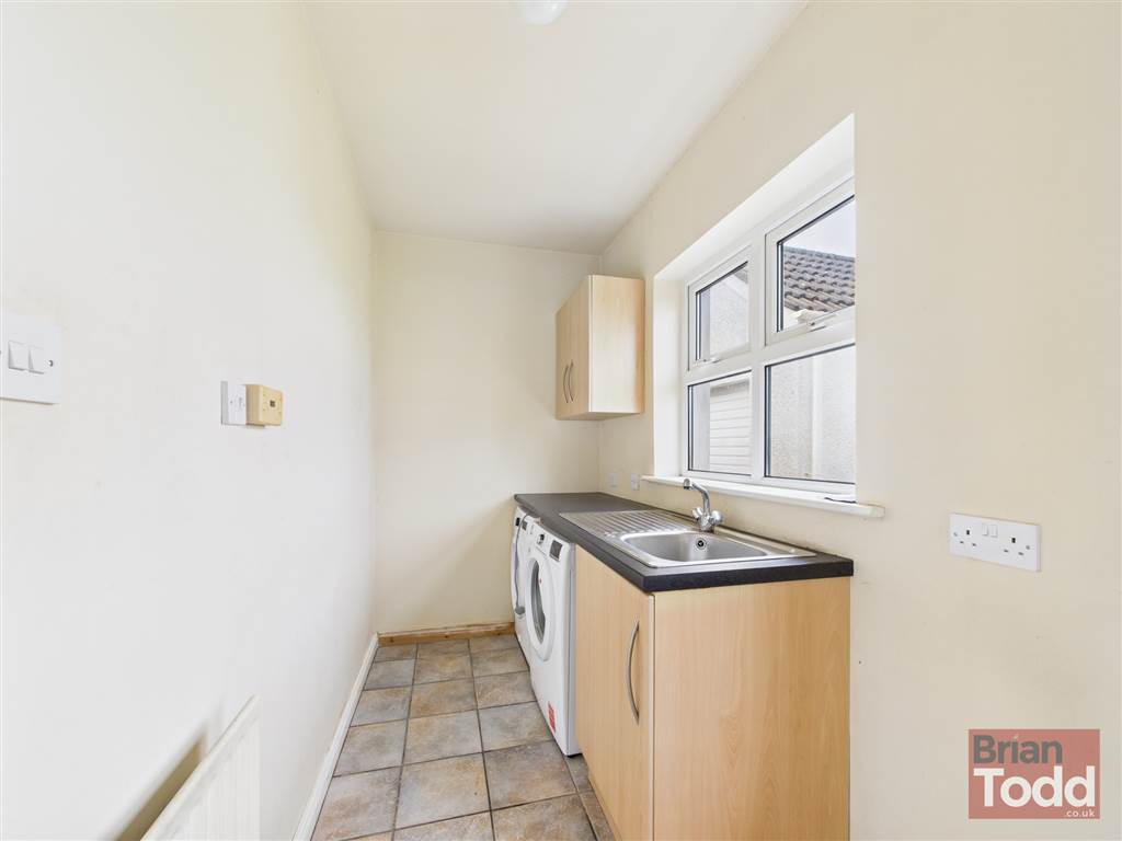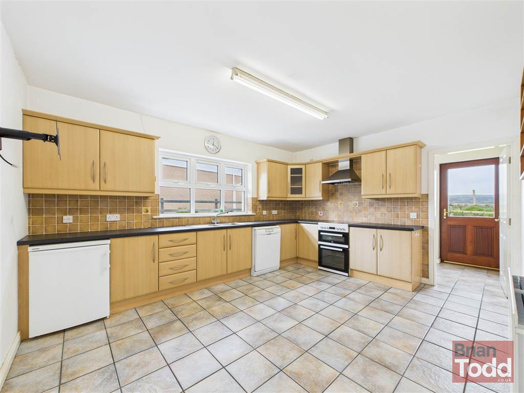 Modern range of fitted upper and lower level units. Integrated extractor fan. Stainless steel sink unit. Plumbed for dishwasher. Floor tiling. Part wall tiling.