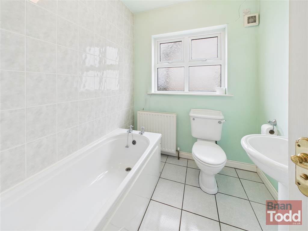 Modern white suite incorporating low level W.C., pedestal wash hand basin and panelled bath. Floor and wall tiling.