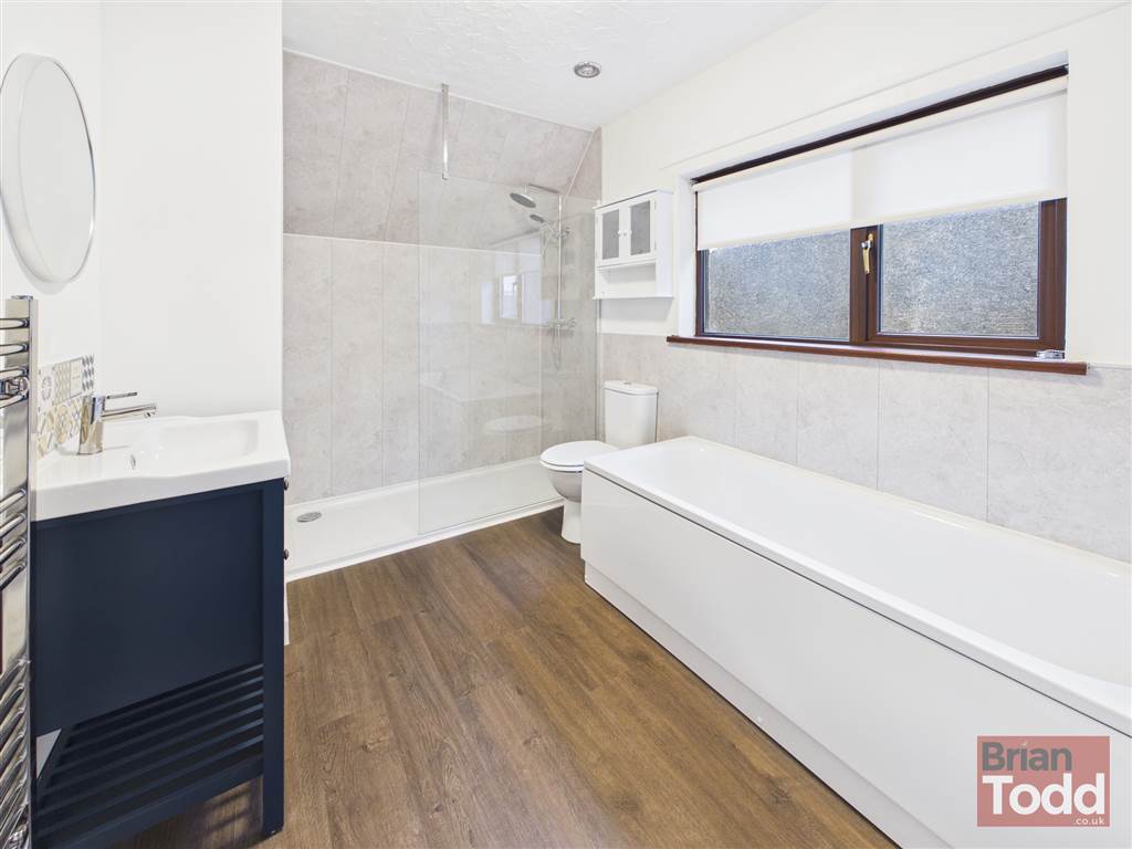 Two upstairs bedrooms and newly installed white bathroom suite, double shower cubicle with gas powered shower, bath, wash hand basin and W.C.