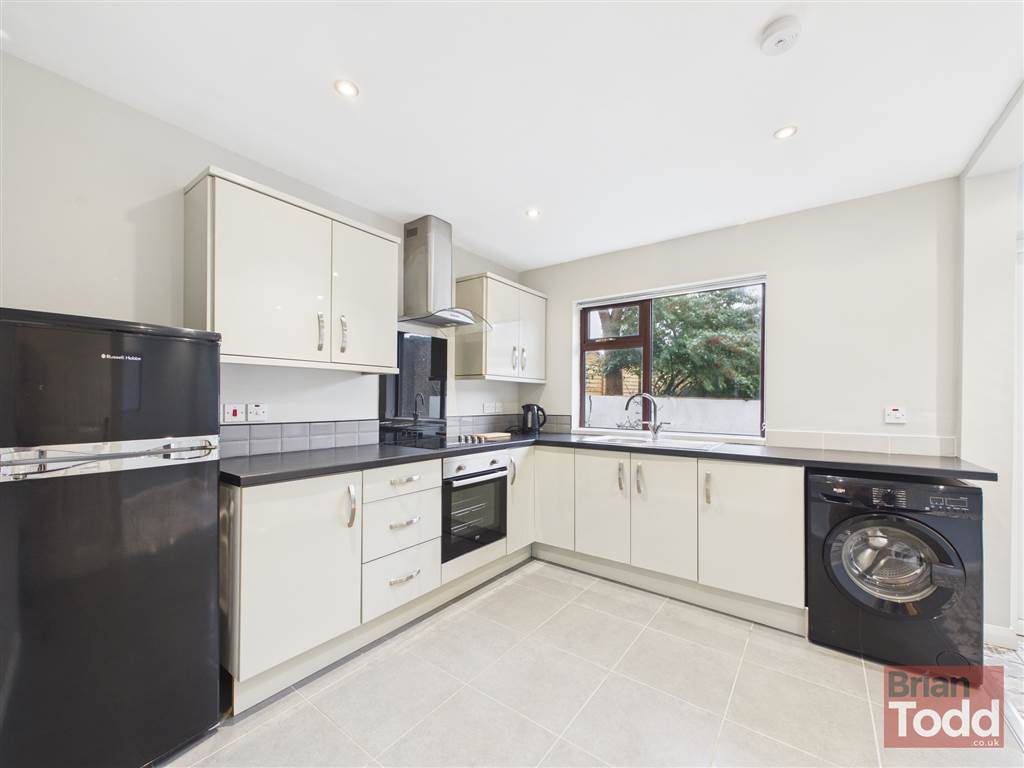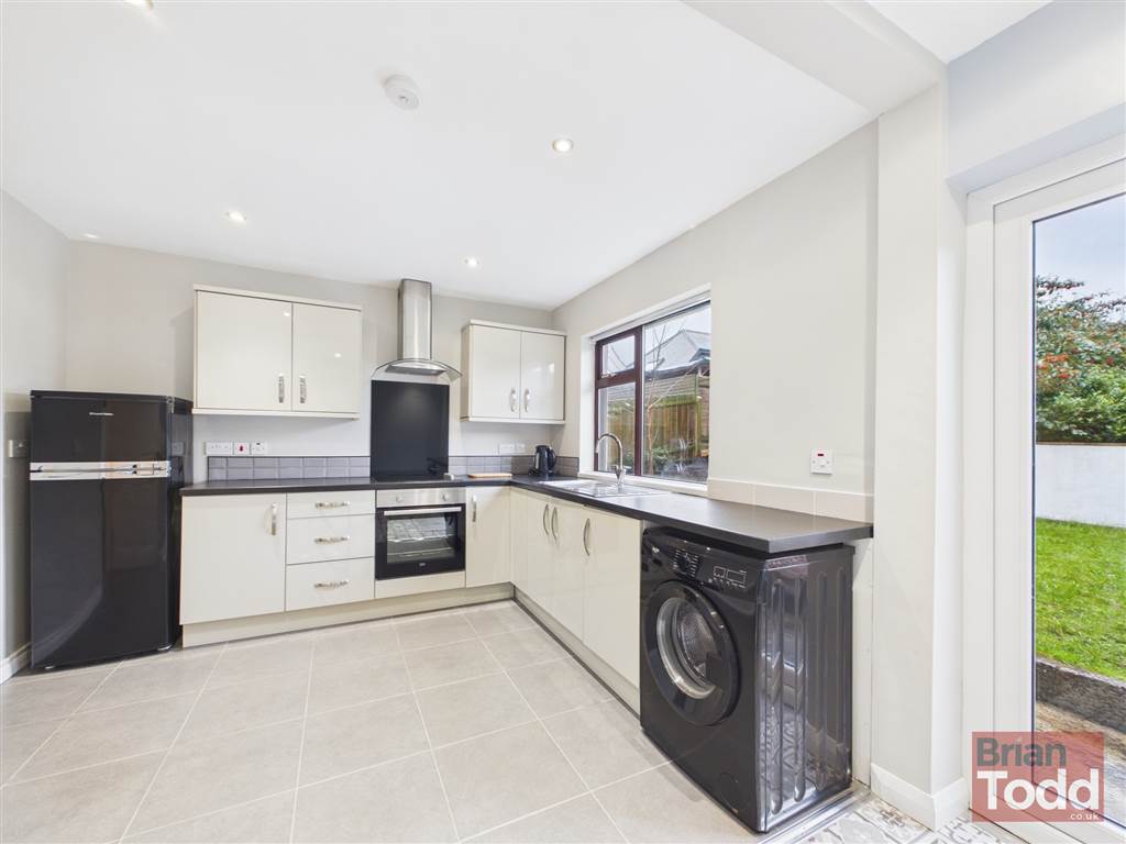 Modern kitchen with upper and lower units, integrated hob,oven and extractor fan. Freestanding washing machine and fridge freezer. Tiled floor. Casual dinning area with patio door to rear garden.