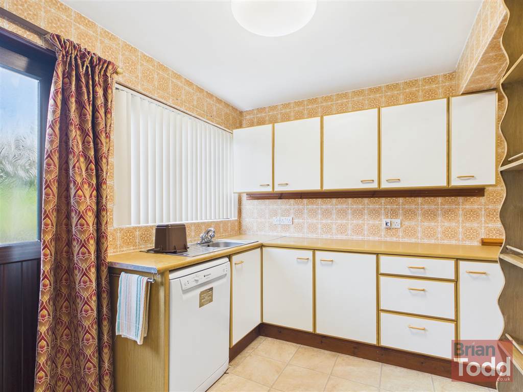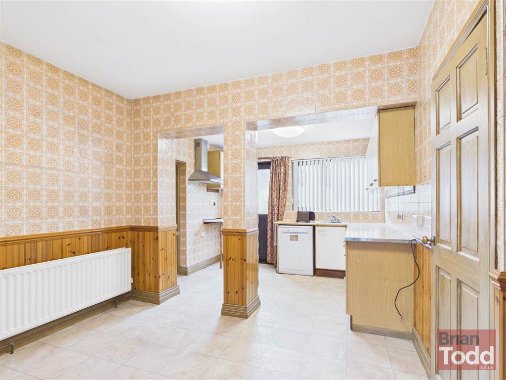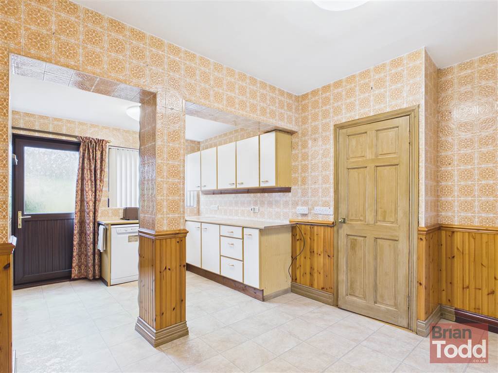 Range of fitted upper and lower level units. Stainless steel sink unit. Plumbed for dishwasher. Part wall tiling. Casual dining area.