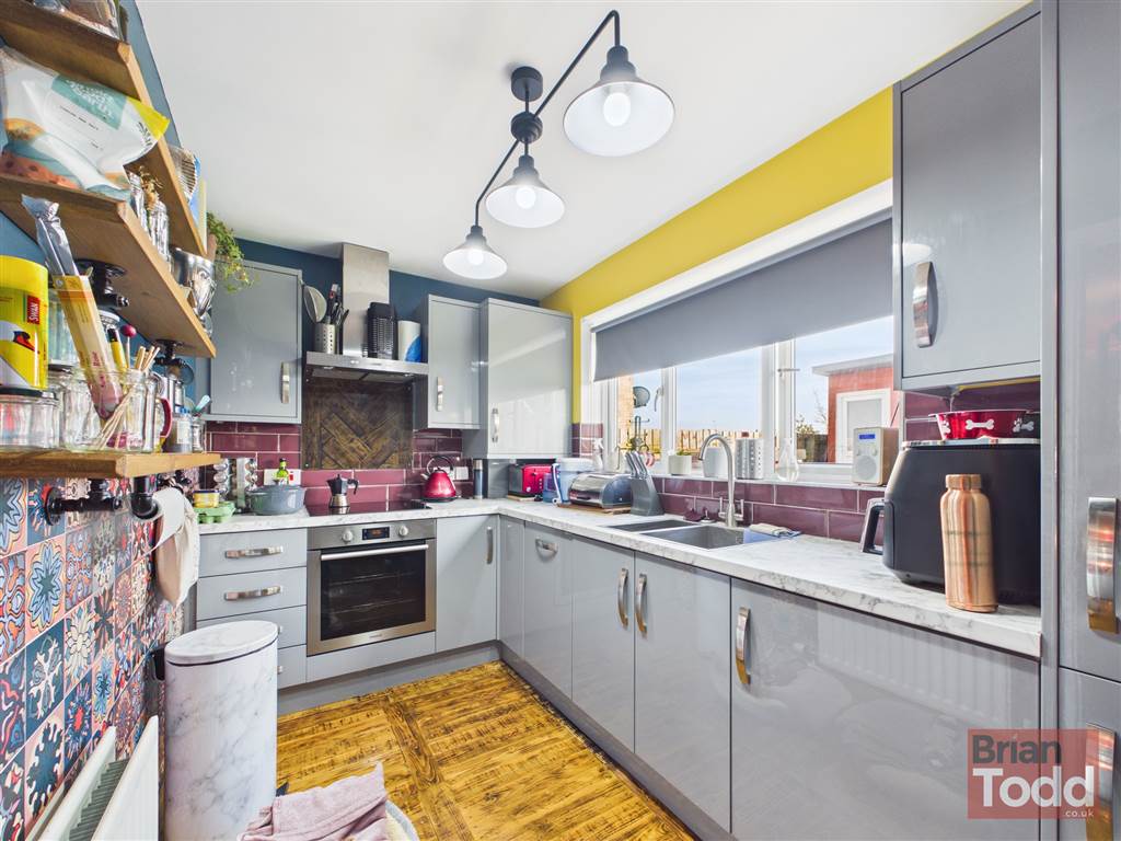 Modern range of fitted upper and lower level units. Integrated electric hob, oven, extractor fan, dishwasher, washing machine and fridge/freezer. Stainless steel sink unit. Part wall tiling. Wood flooring.