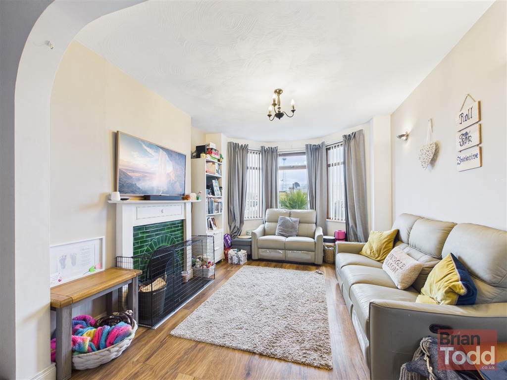 A spacious bright room, with bay window feature. High mantle fireplace with open fire. Laminate wood flooring. Decorative archway divide.