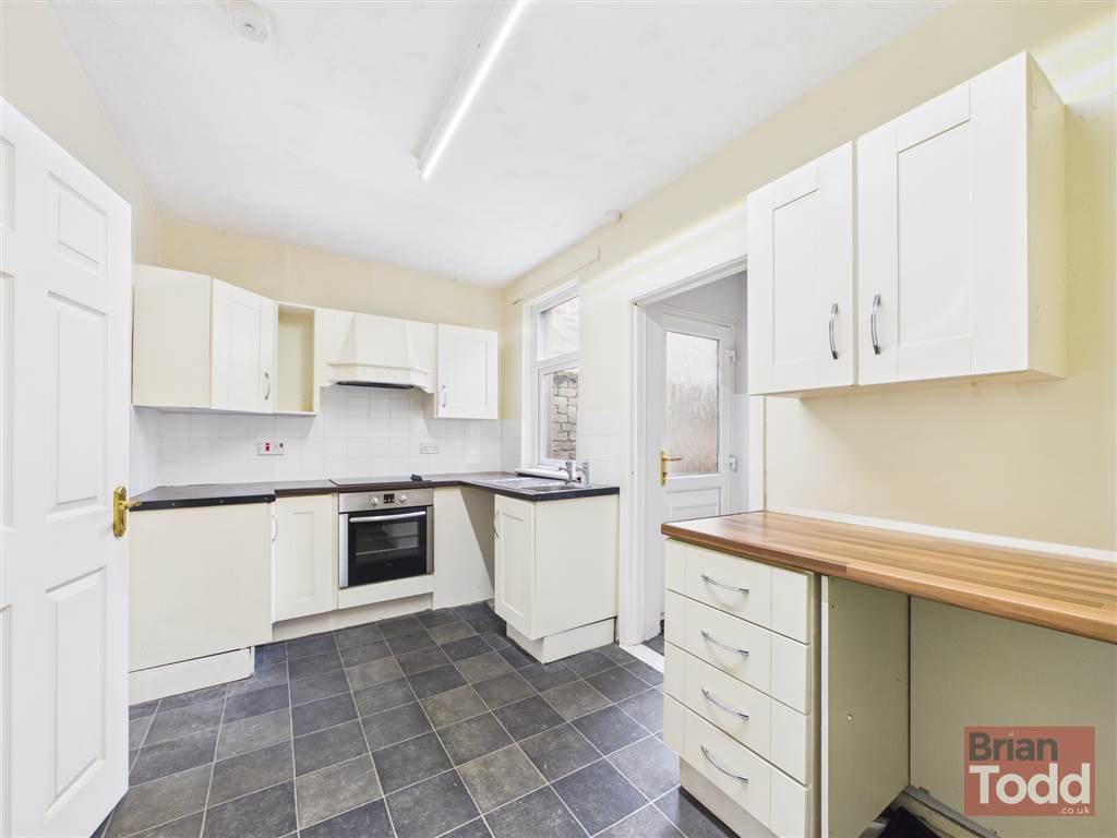 Modern range of fitted upper and lower level units. Integrated electric hob, oven and extractor fan. Plumbed for automatic washing machine.