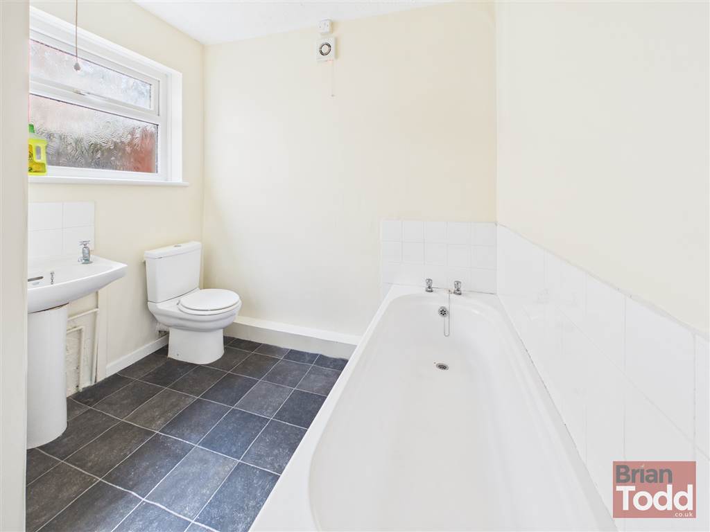 Modern white suite incorporating push button W.C., pedestal wash hand basin and panelled bath. Extractor fan. Part wall tiling.