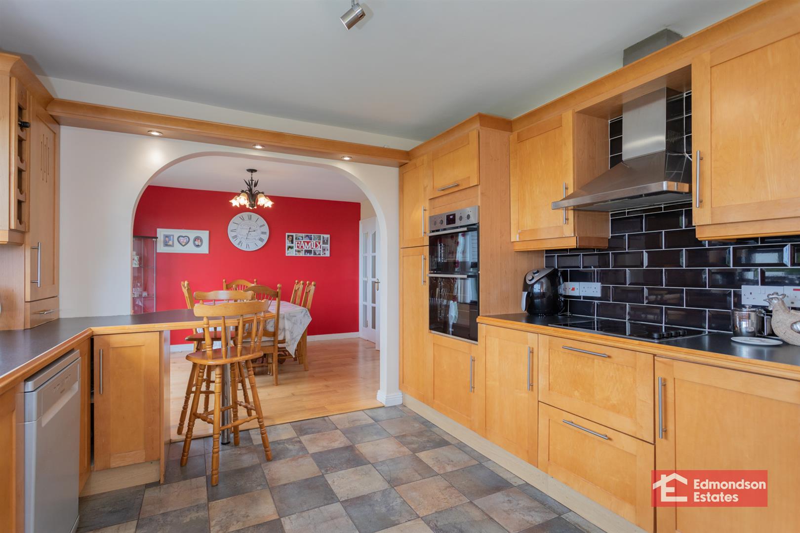 Beech effect low level units. Stainless steel sink. Space for dishwasher. Breakfast bar. Wine rack. Integrated fridge freezer. Halogen Hob with Stainless steel extractor fan. Eye level oven. Tiled backsplash. Tiled flooring.