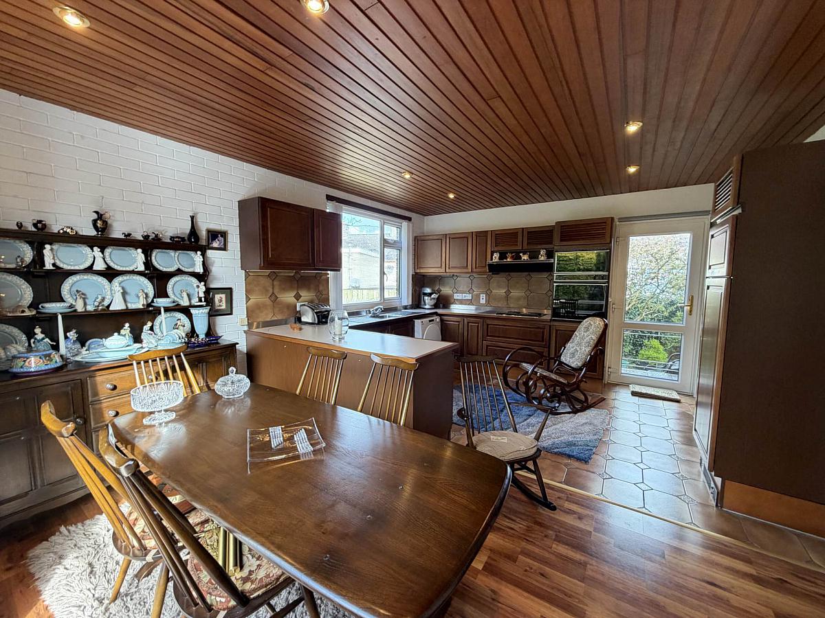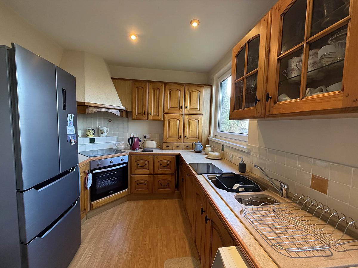 Range of high and low level pegged pine units & drawers. Diisplay cabinets. Laminate work tops. Single drainer sink unit with vegetable basin. Plumbed for washing machine. Zanussi four ring induction hob. Canopy extractor fan. Candy low level oven. Part tiled walls. Laminate wood flooring.
