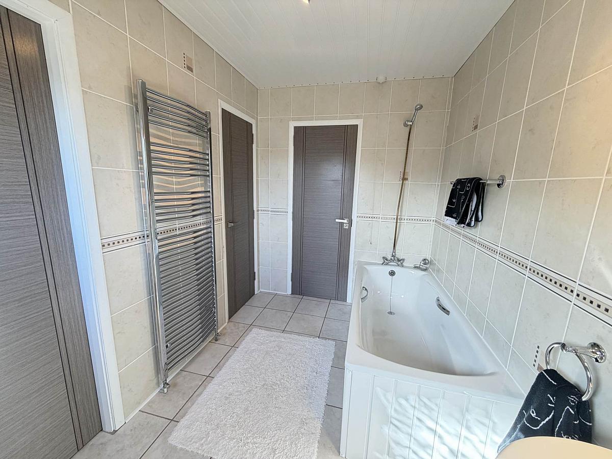 Fully tiled. Panelled bath with telephone hand shower. Low flush WC. Wash hand basin. Chrome towel radiator. Hot press. UPVC clad ceiling.