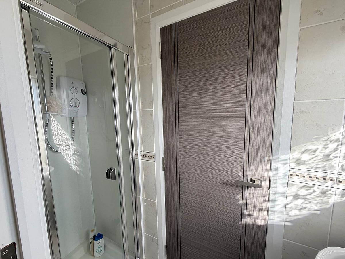 Fully tiled. Shower cubicle with Mira Sport electric fitting. Wash hand basin. Door to:
