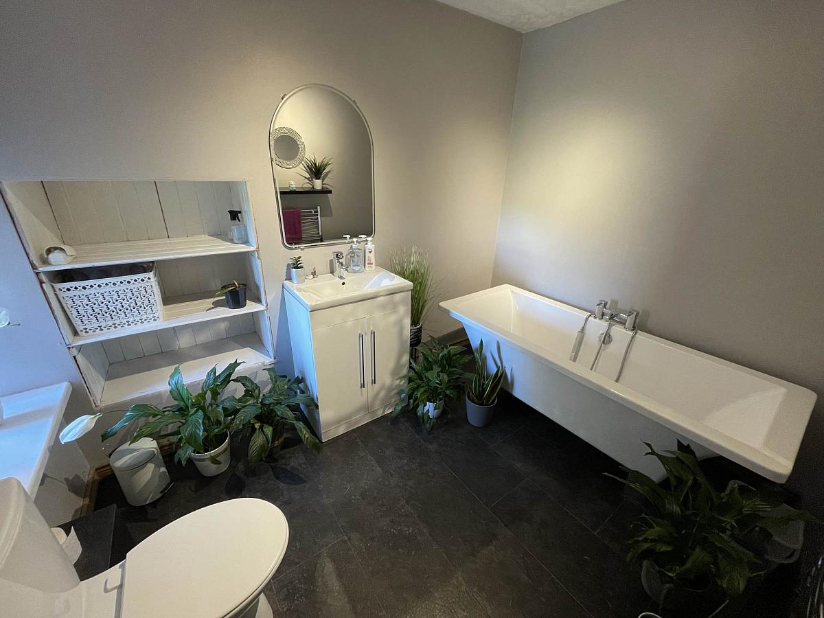 Modern 3 Piece Bathroom Suite Featuring Freestanding Bath