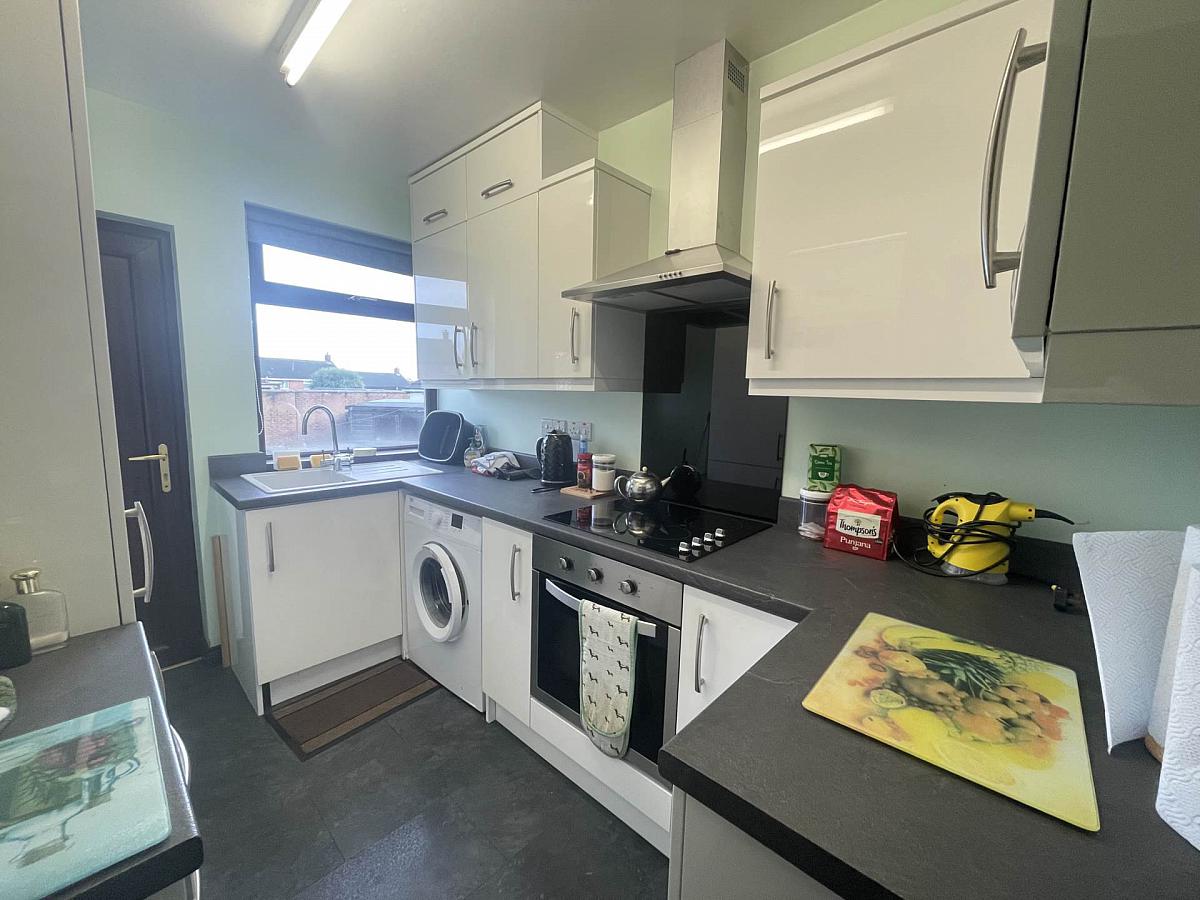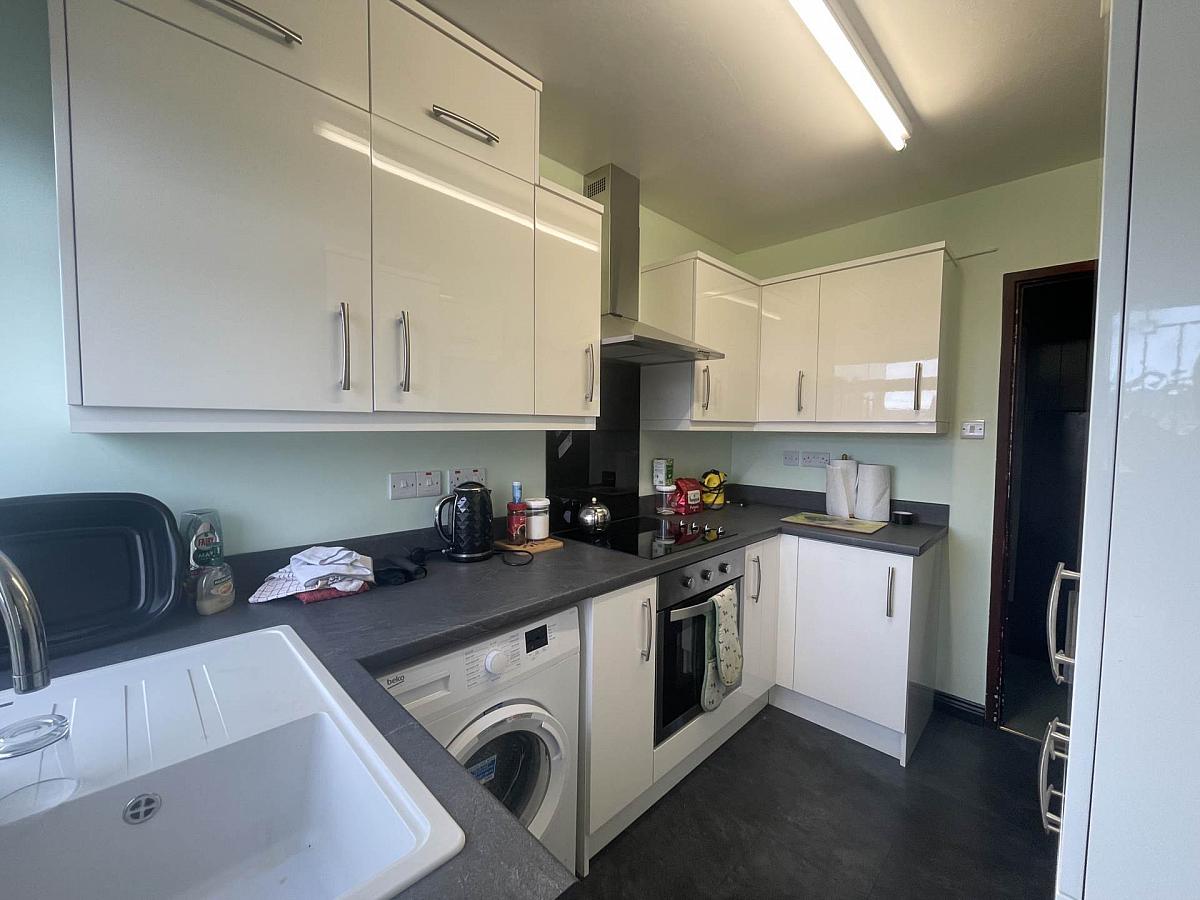 Good range of high & low level gloss units. Under unit lighting. Laminate work tops & up stands. Single drainer sink unit. `New world` four ring electric hob. `Belling` low level oven.Stainless steel extractor fan. integrated microwave and fridge/freezer. Plumbed for washing machine. UPVC back door.