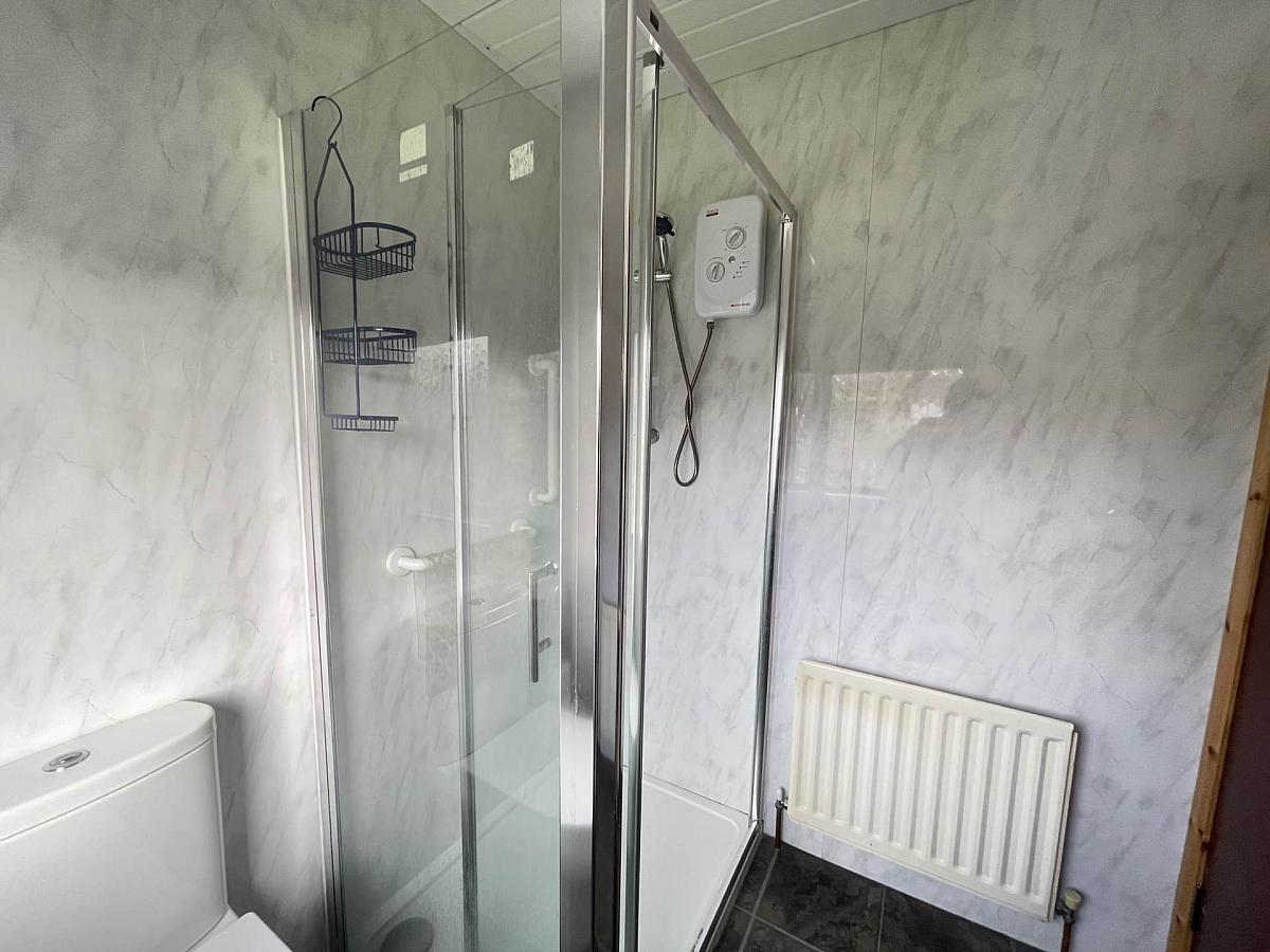White suite comprising low flush WC, wash hand basin and corner shower cubicle with Aqua Profile Plus electric shower fitting. UPVC panelled walls.