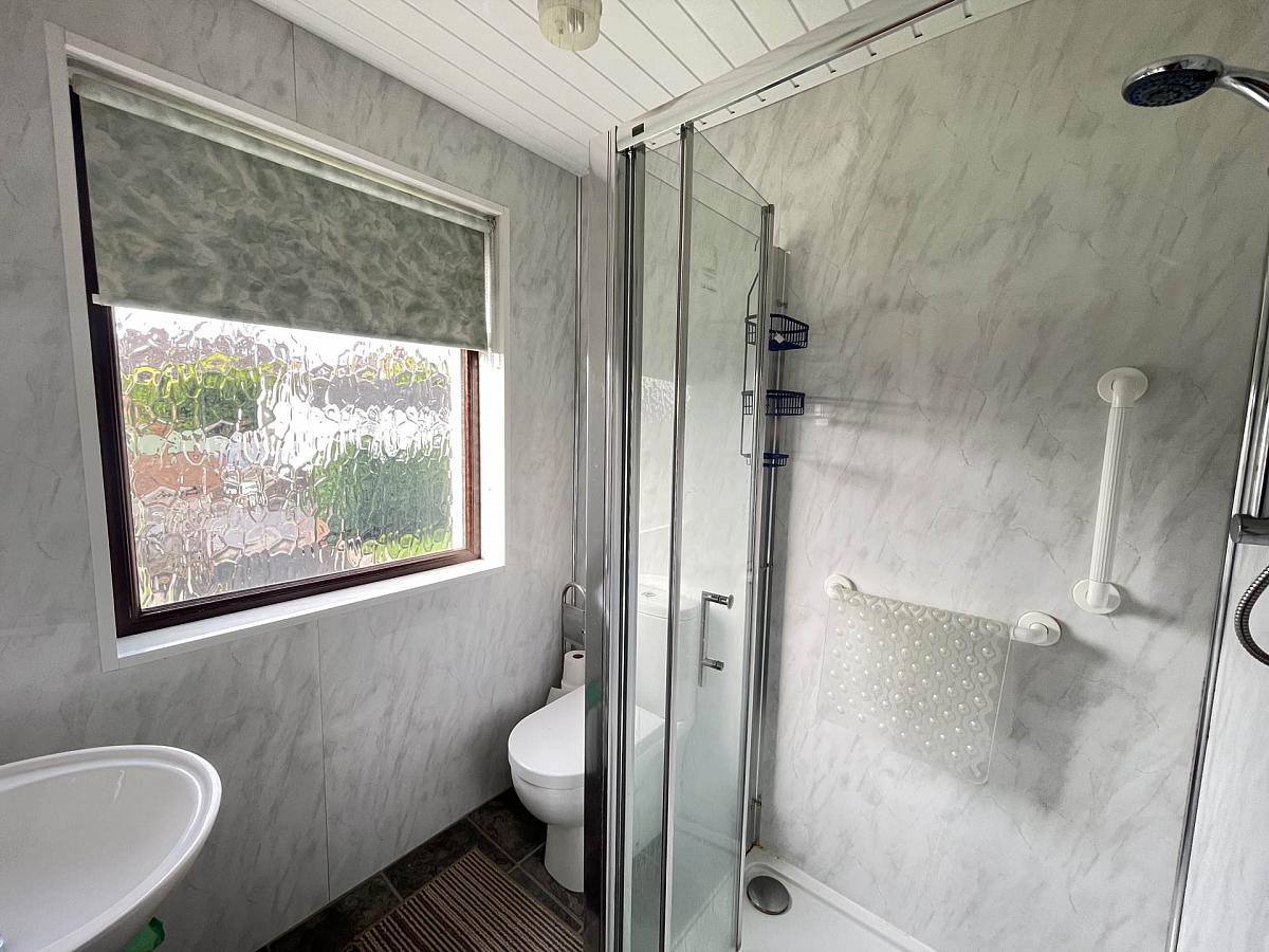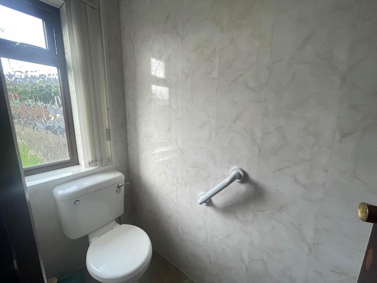 Low flush WC. UPVC panelled walls. Tiled floor.