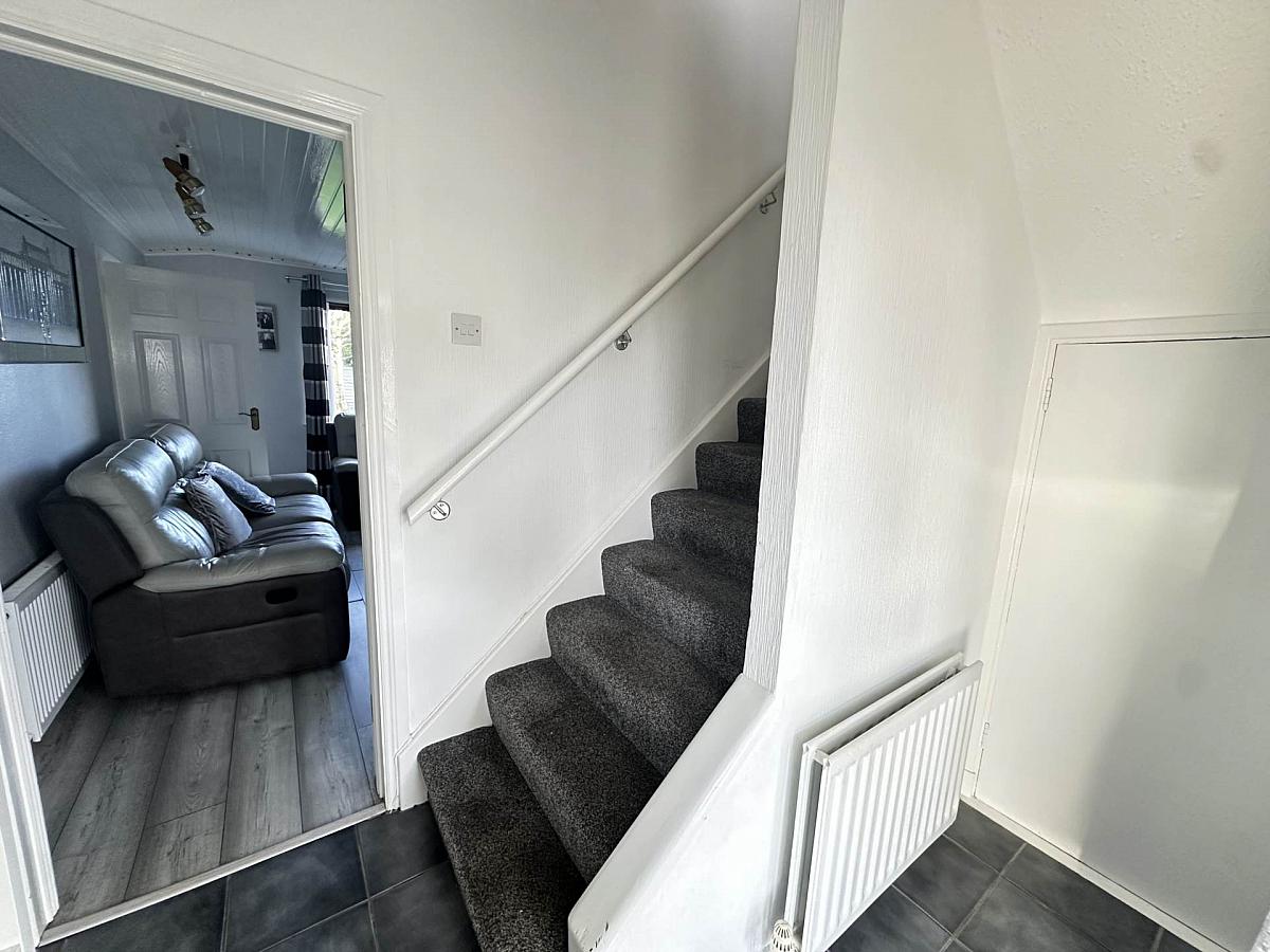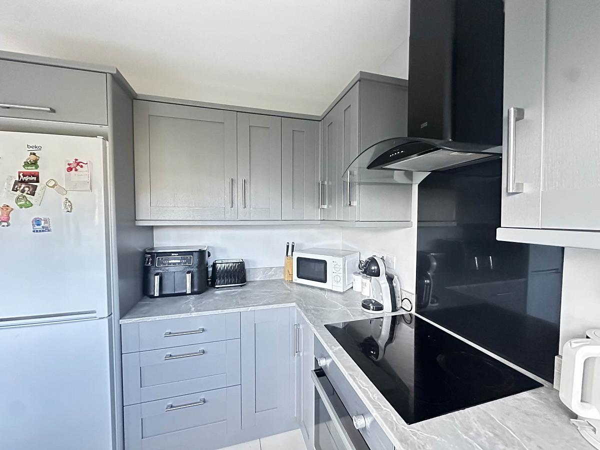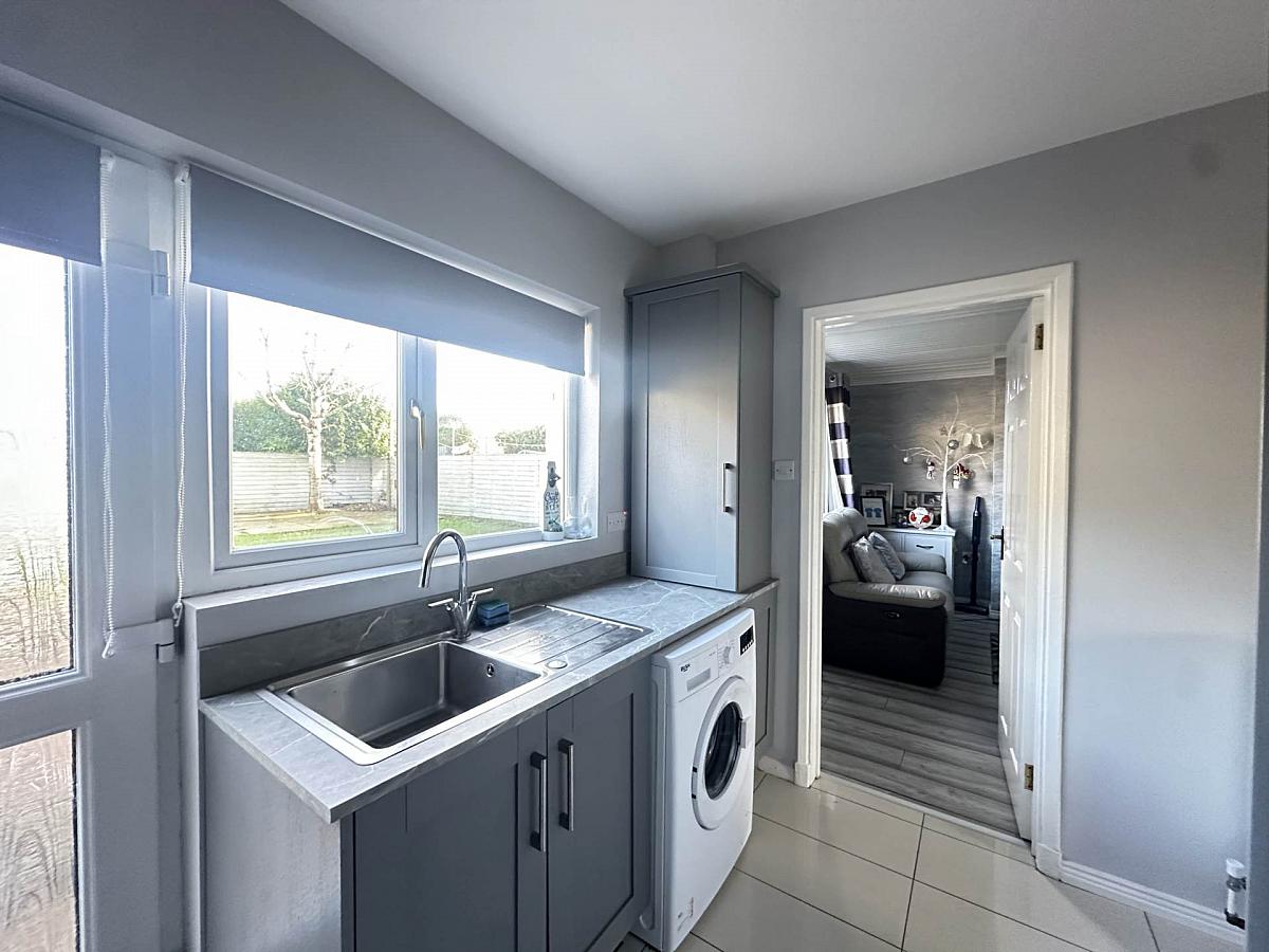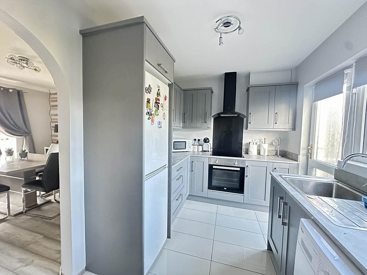 Range of high and low level shaker style units. Laminate work tops and up stands. Single drainer stainless steel sink unit. Beko low level oven and induction hob. Plumbed for dishwasher. Space for fridge/freezer. Cupboard housing gas fired central heating boiler. Tiled floor. Arch way leading to: