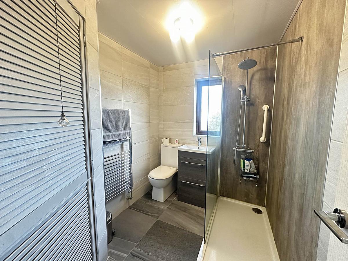 Contemporary fitted shower room with double walk in shower and thermostatically controlled Rainforest shower fitting. Low flush WC. Vanity unit. Part UPVC walls and part tiled. Tiled floor. Airing cupboard.