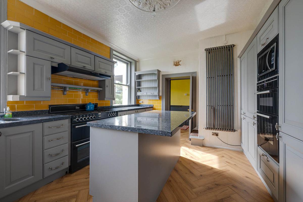 Inlaid stainless steel sink unit and mixer tap with vegetable basin. Excellent range of built in high and low level units. Granite work surfaces. Island unit with breakfast bar and cupboards under. Glazed display cabinet. Integrated fridge, Indesit double oven and Kenwood microwave oven. Part tiled walls. Tiled floor. Recess for range. Connecting door to annex. Service staircase to first floor.