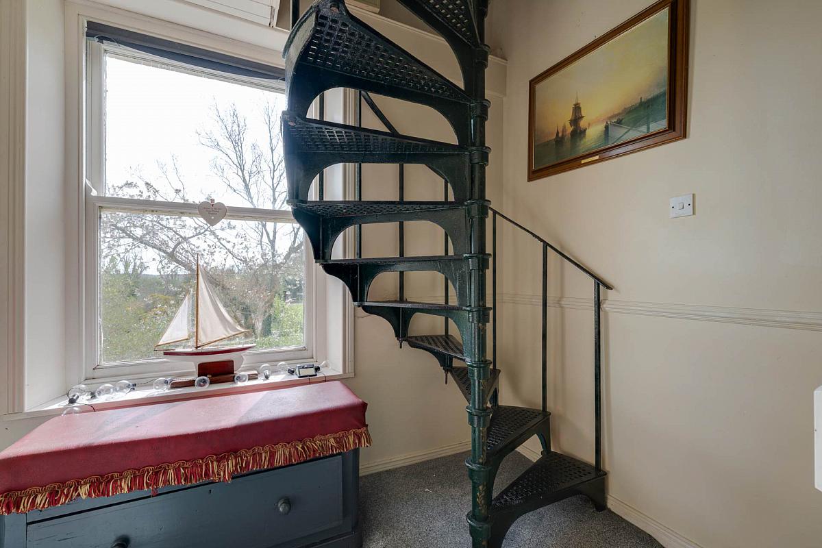 reception room with brick built fireplace, large bright sun room with sea views, kitchen, bathroom and 2 beds plus study. Both bedroom 2 and the study are approached by an ornate cast iron spiral staircase.