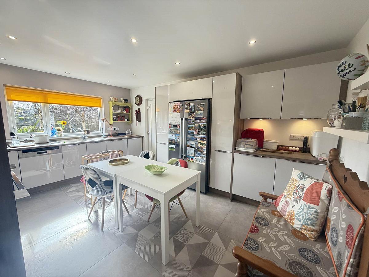 Excellent range of high and low level gloss units. Under unit lighting. Laminate work tops, up stands and splash back. Single drainer sink unit. Smeg oven. CDA four ring induction hob. Stainless steel extractor fan. Smeg integrated dishwasher. Beko integrated washing machine. Contemporary tiled floor with decorative inset feature.