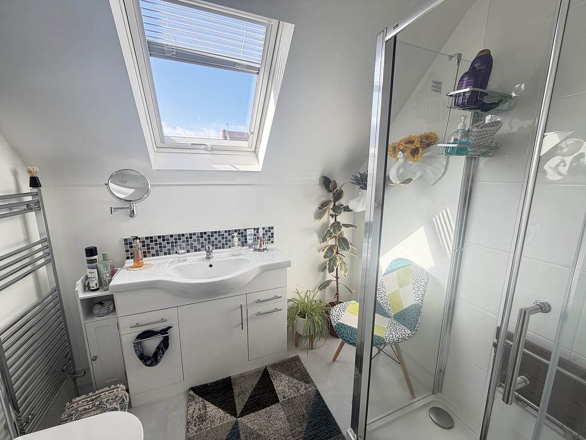 White suite - low flush WC and vanity wash hand basin. Double walk in tiled cubicle with Mira sport electric shower fitting. Chrome towel radiator. Velux window.