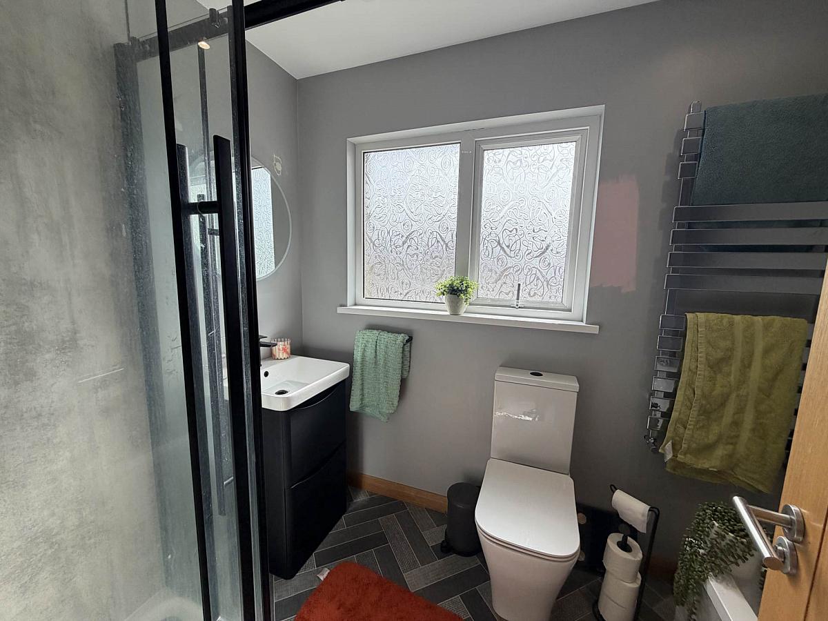 Contemporary fitted bathroom with bath tub and separate shower cubicle with thermostatically controlled Rainforest fitting and UPVC multi panel. Low flush WC. Vanity unit. Chrome towel radiator.