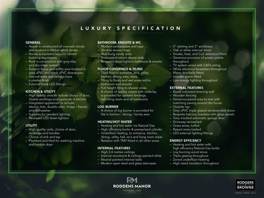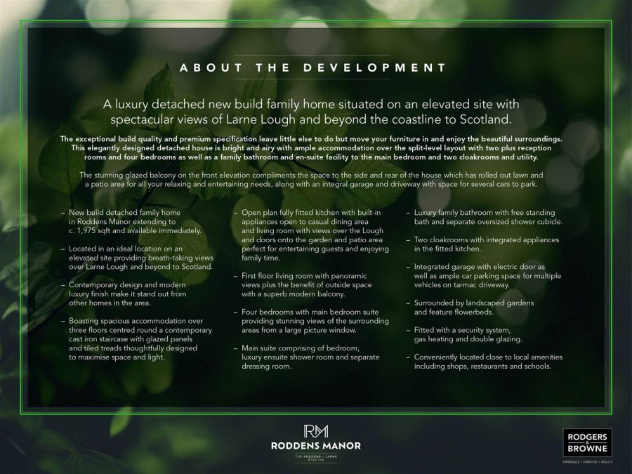 A luxury detached new build family home situated on an elevated site with spectacular views of Larne Lough and beyond the coastline to Scotland. The exceptional build quality and premium specification leave little else to do but move your furniture in and enjoy the beautiful surroundings. This elegantly designed detached house is bright and airy with ample accommodation over the split-level layout with two plus reception rooms and four bedrooms as well as a family bathroom and ensuite facility to the main bedroom and two cloakrooms and utility. The stunning glazed balcony on the front elevation compliments the space to the side and rear of the house which has rolled out lawn and a patio area for all your relaxing and entertaining needs, along with an integral garage and driveway with space for several cars to park.