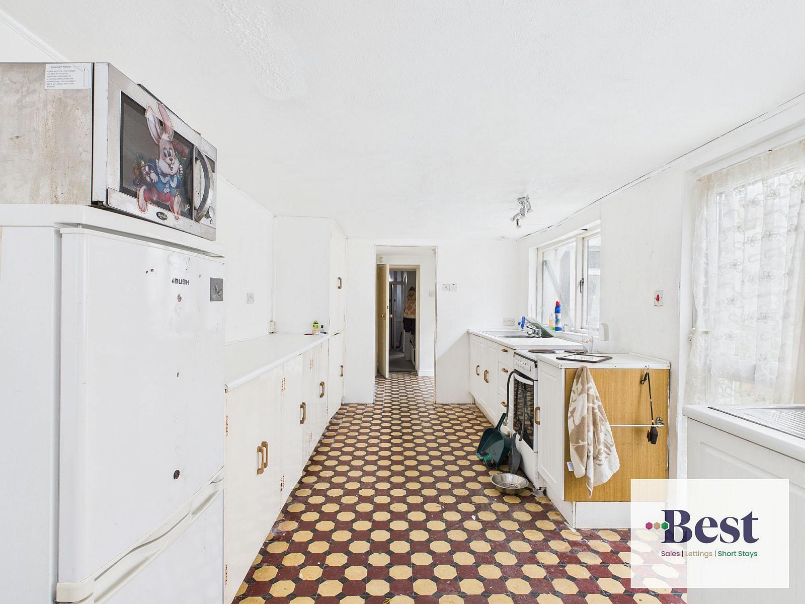 A range of high and low level cupboards. Stainless steel sink. Boiler. Original tiled flooring.
