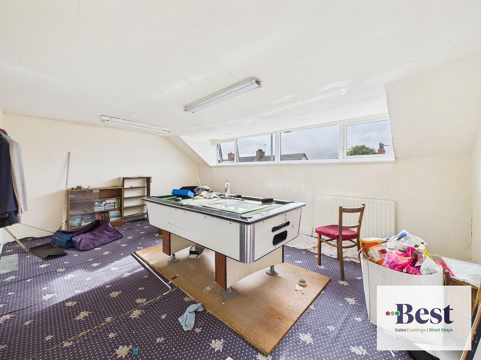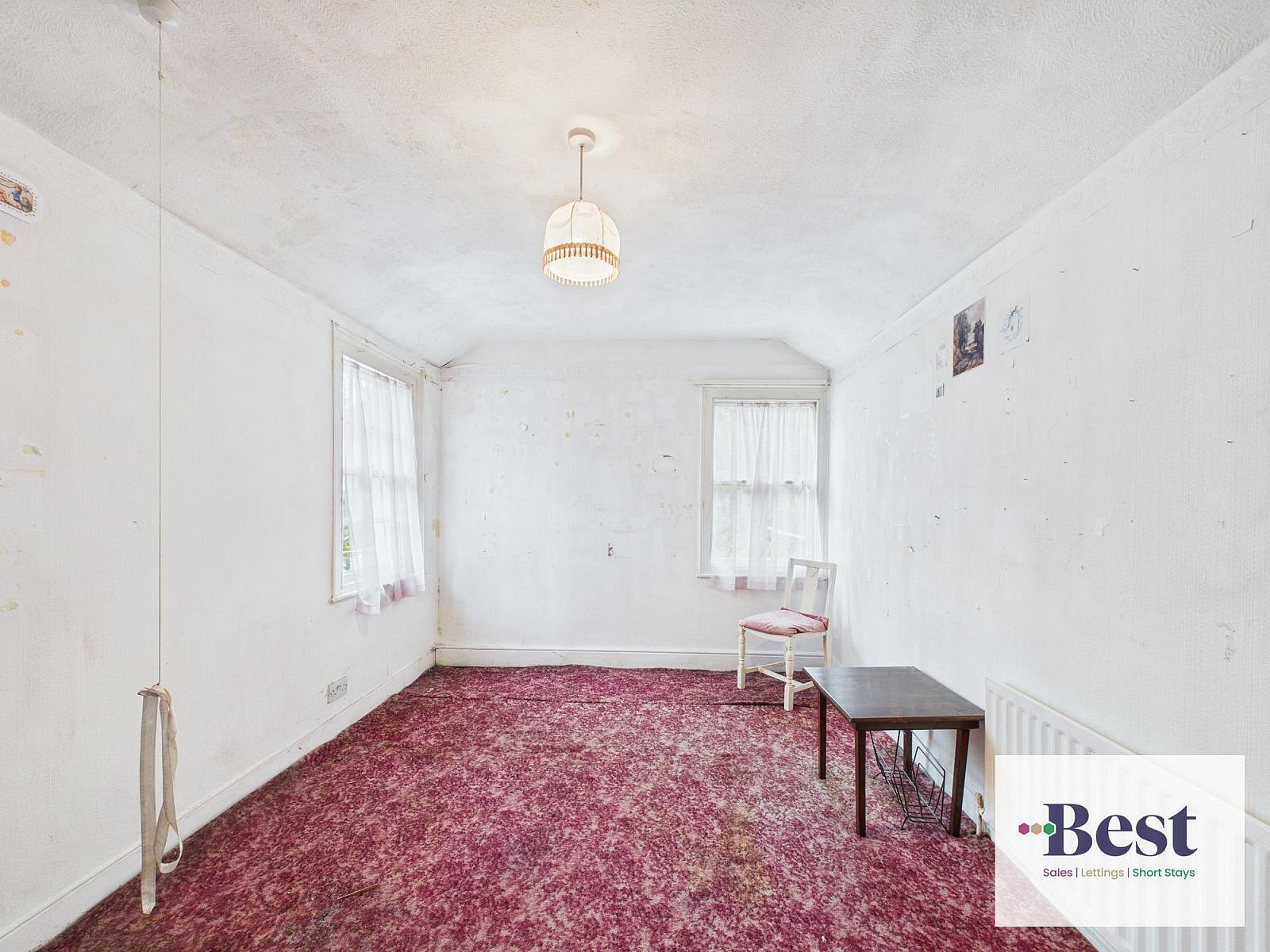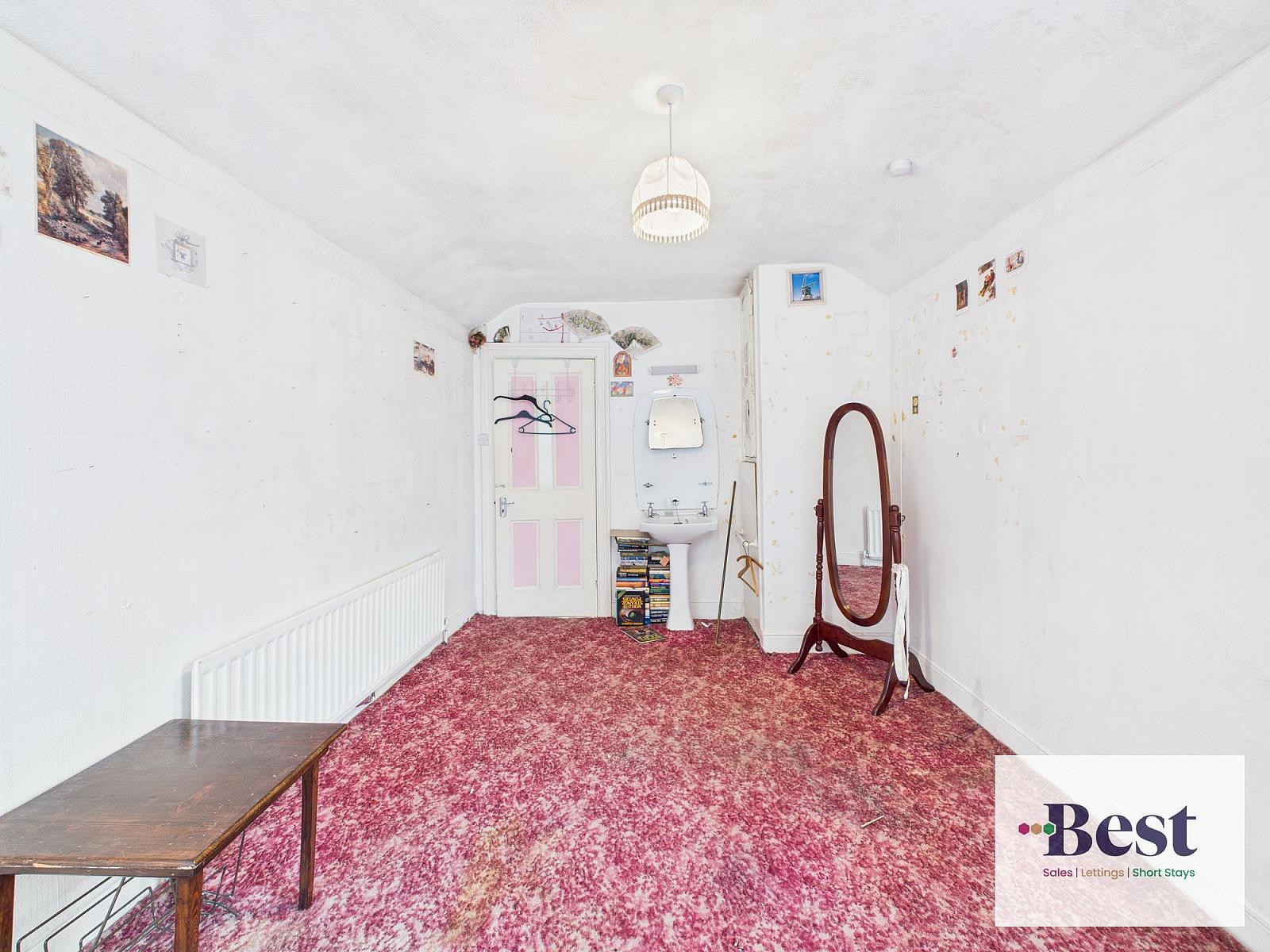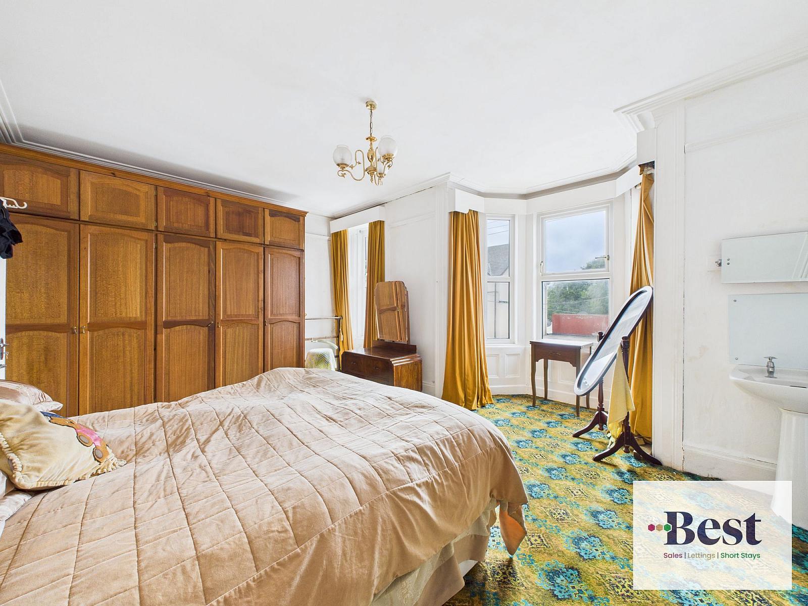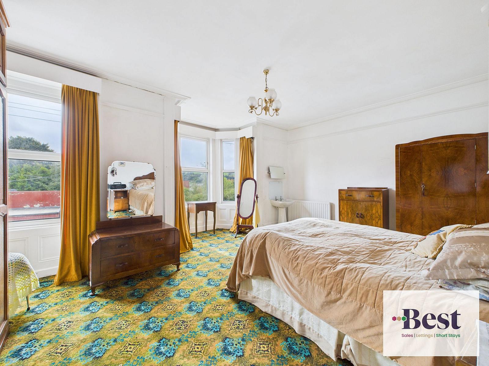 Generous sized bedroom with bay window. Pedestal wash hand basin.