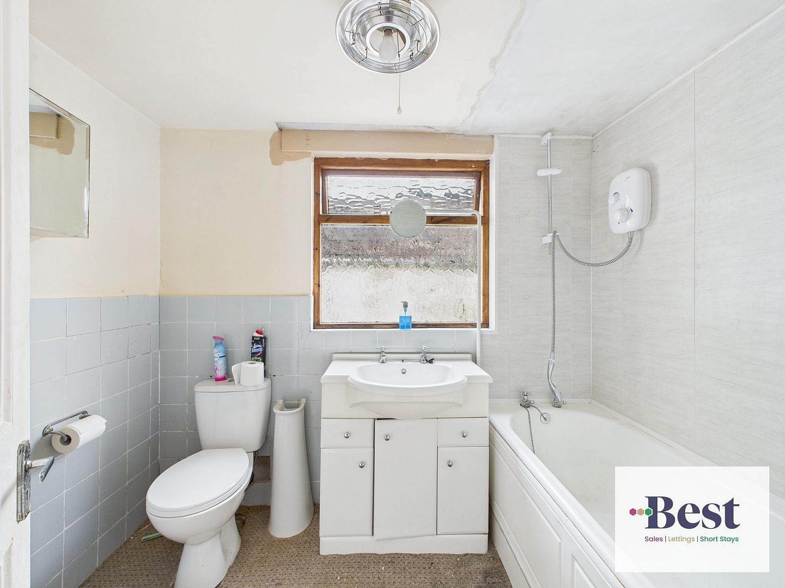 White suite with low flush wc, pedestal wash hand basin and panelled bath with electric over shower.