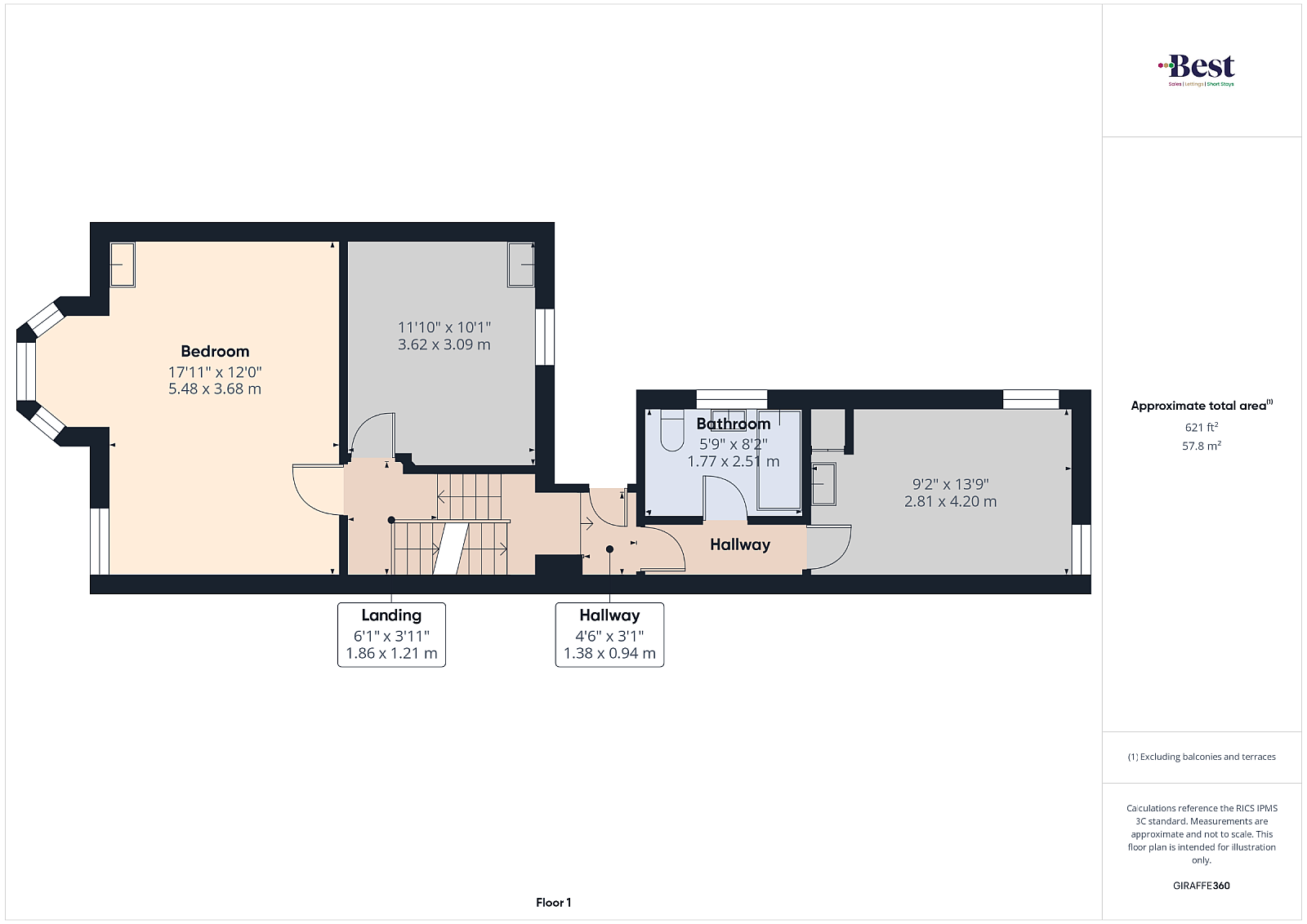 Bedroom 1 w: 4.28m x l: 2.8m (w: 14' 1" x l: 9' 2")
