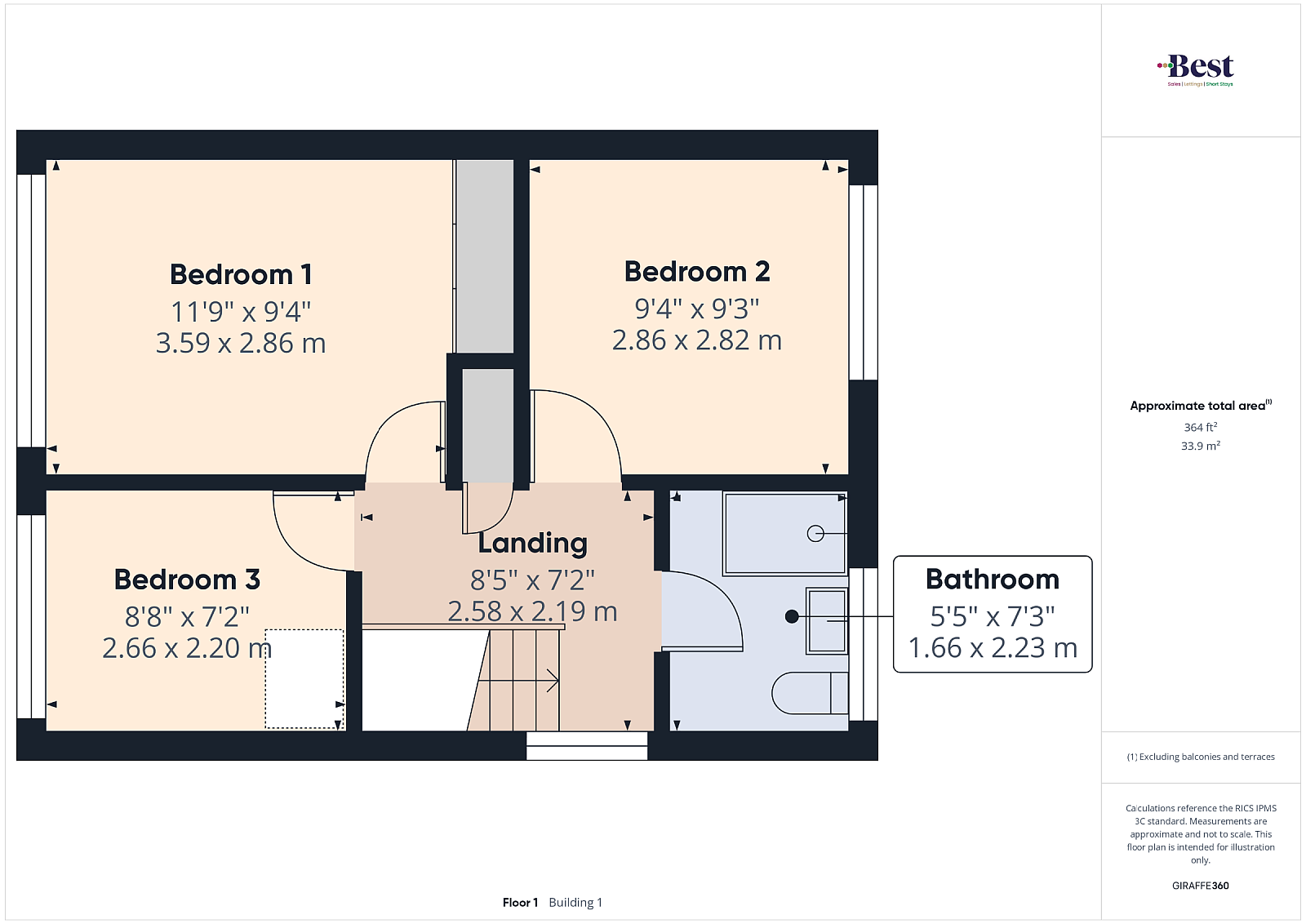 Bedroom 1 w: 2.86m x l: 3.59m (w: 9' 5" x l: 11' 9")