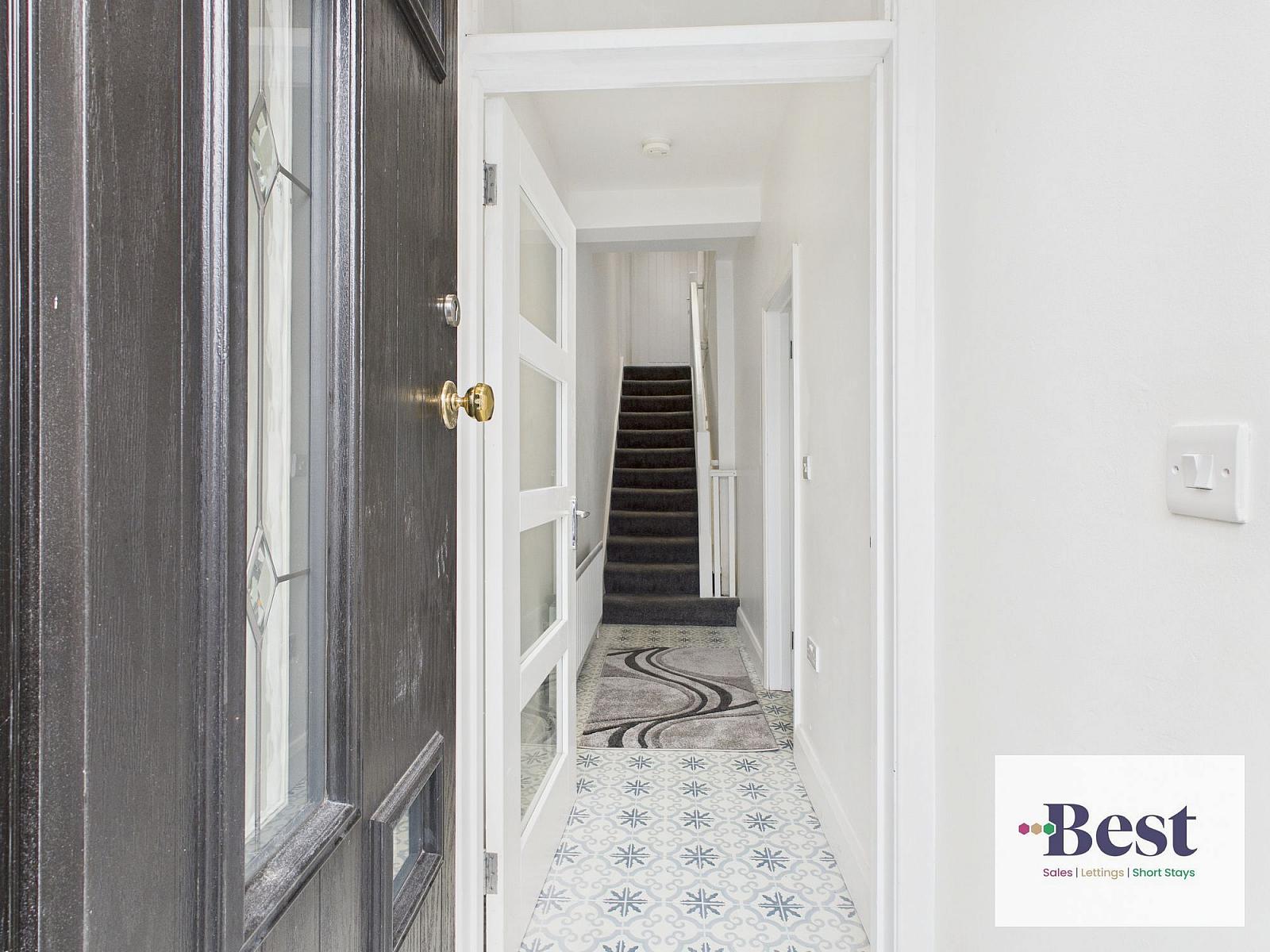Bright entrance hall with feature tile flooring and glazed porch door.