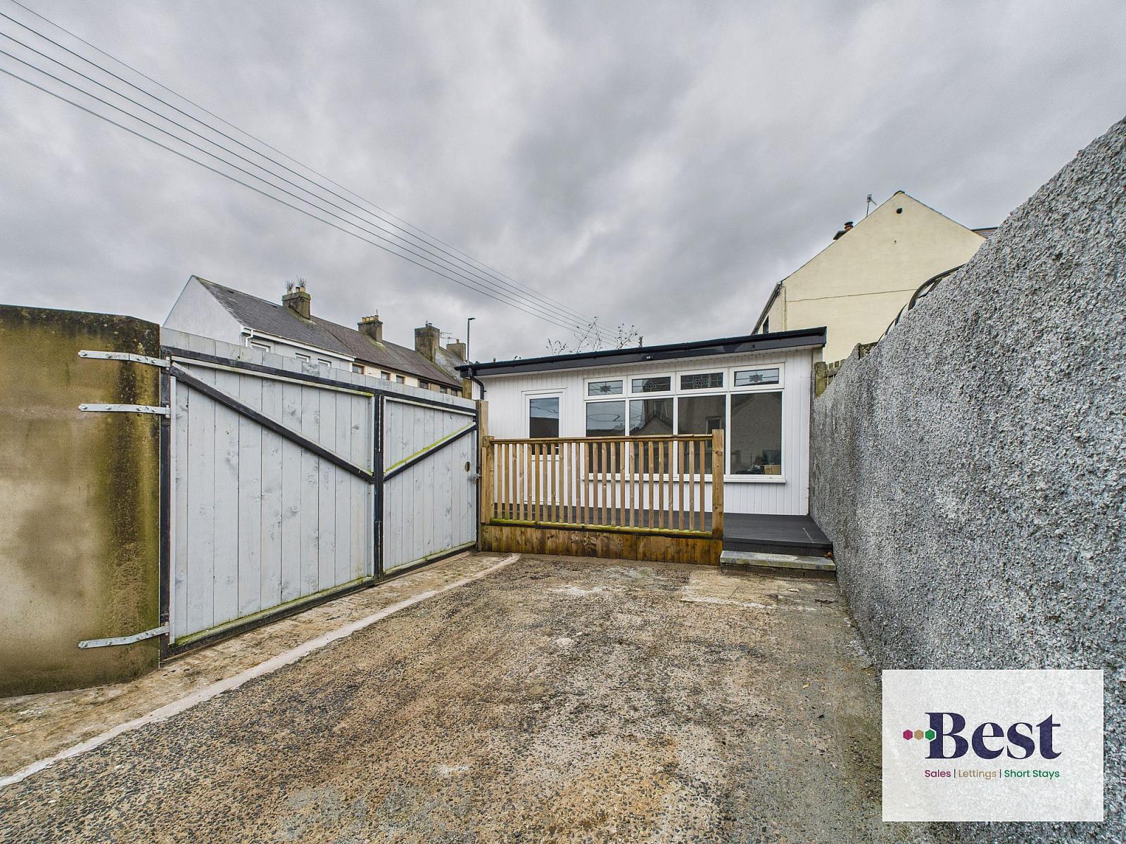 Large dual level rear garden laid in concrete. Fully enclosed via tall walling, featuring a double gate leading directly onto Laharna Avenue.