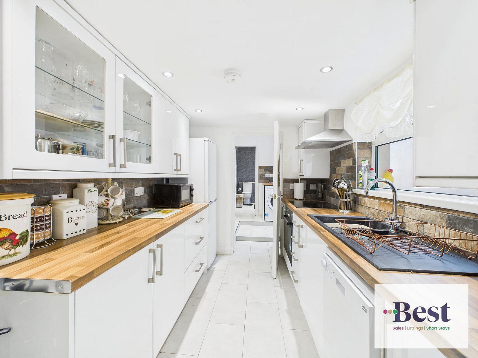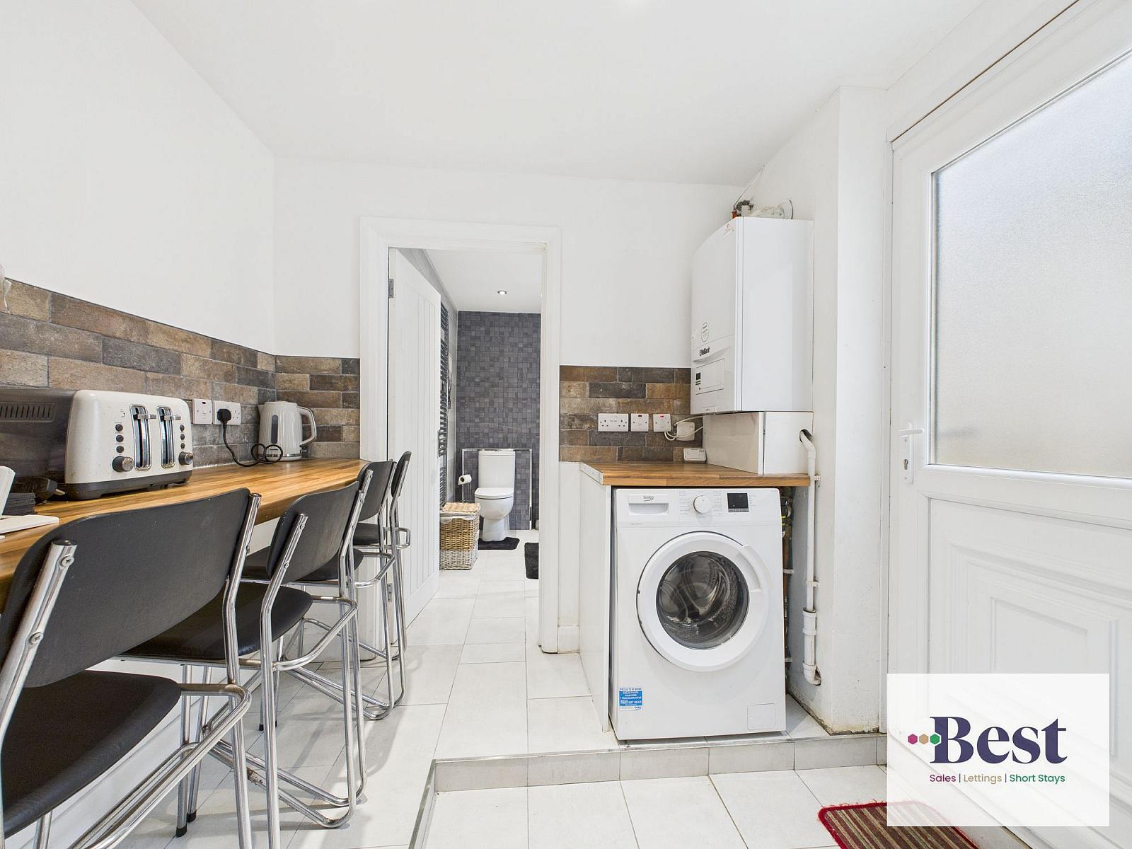 Continued tiled flooring with further matching woodblock worktops. Plumbed space for washer / dryer machine. Provides access to downstairs shower room and rear garden.