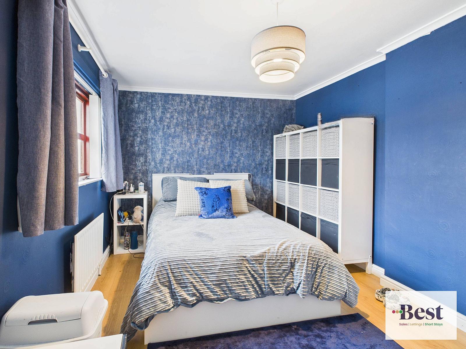 Large double bedroom with oak effect laminate flooring and plenty of space for freestanding furniture.