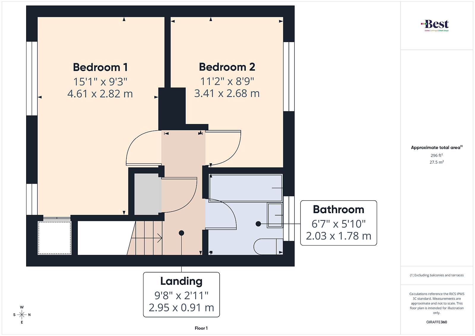 Bedroom 1 w: 4.61m x l: 2.82m (w: 15' 1" x l: 9' 3")