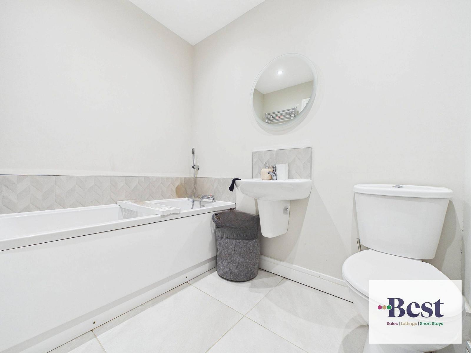White suite comprising low flush WC, pedestal wash hand basin, panelled bath. Crome towel rail. Tiled flooring.