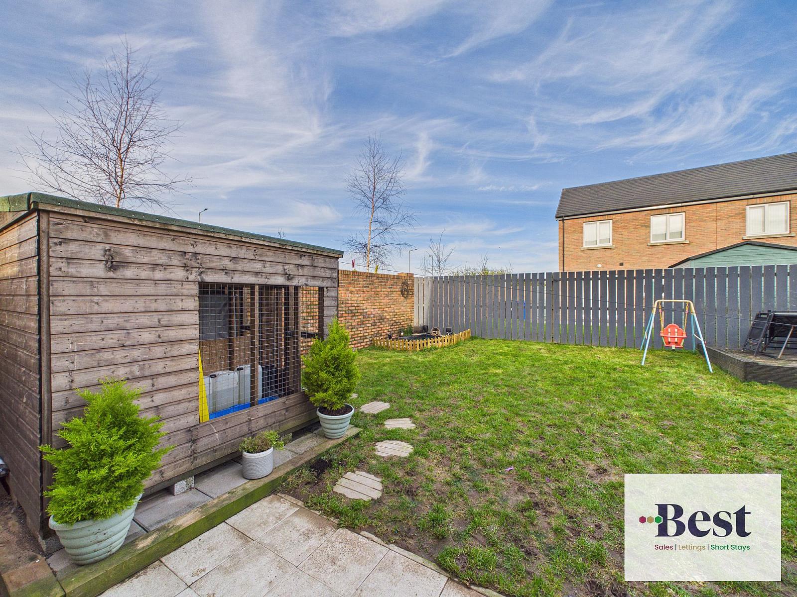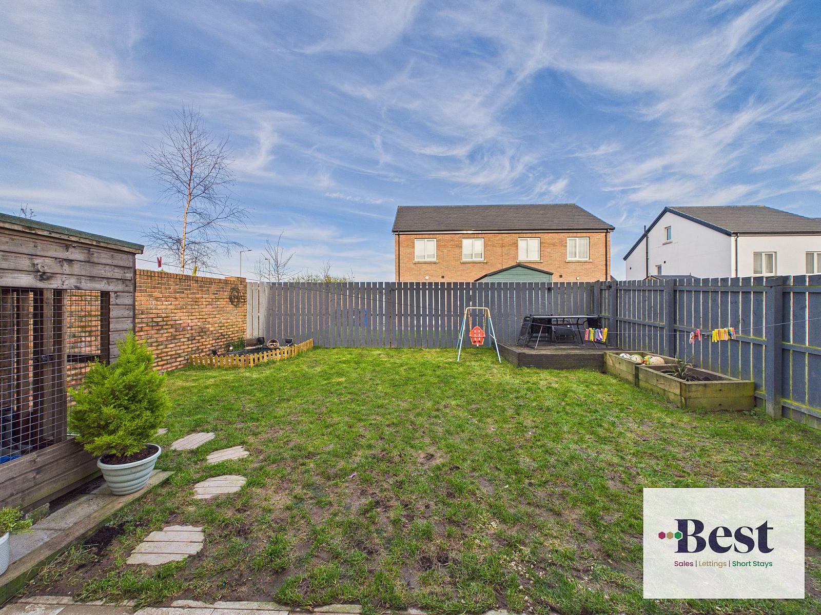 Rear garden fully enclosed. Paved patio area leading to lawn.