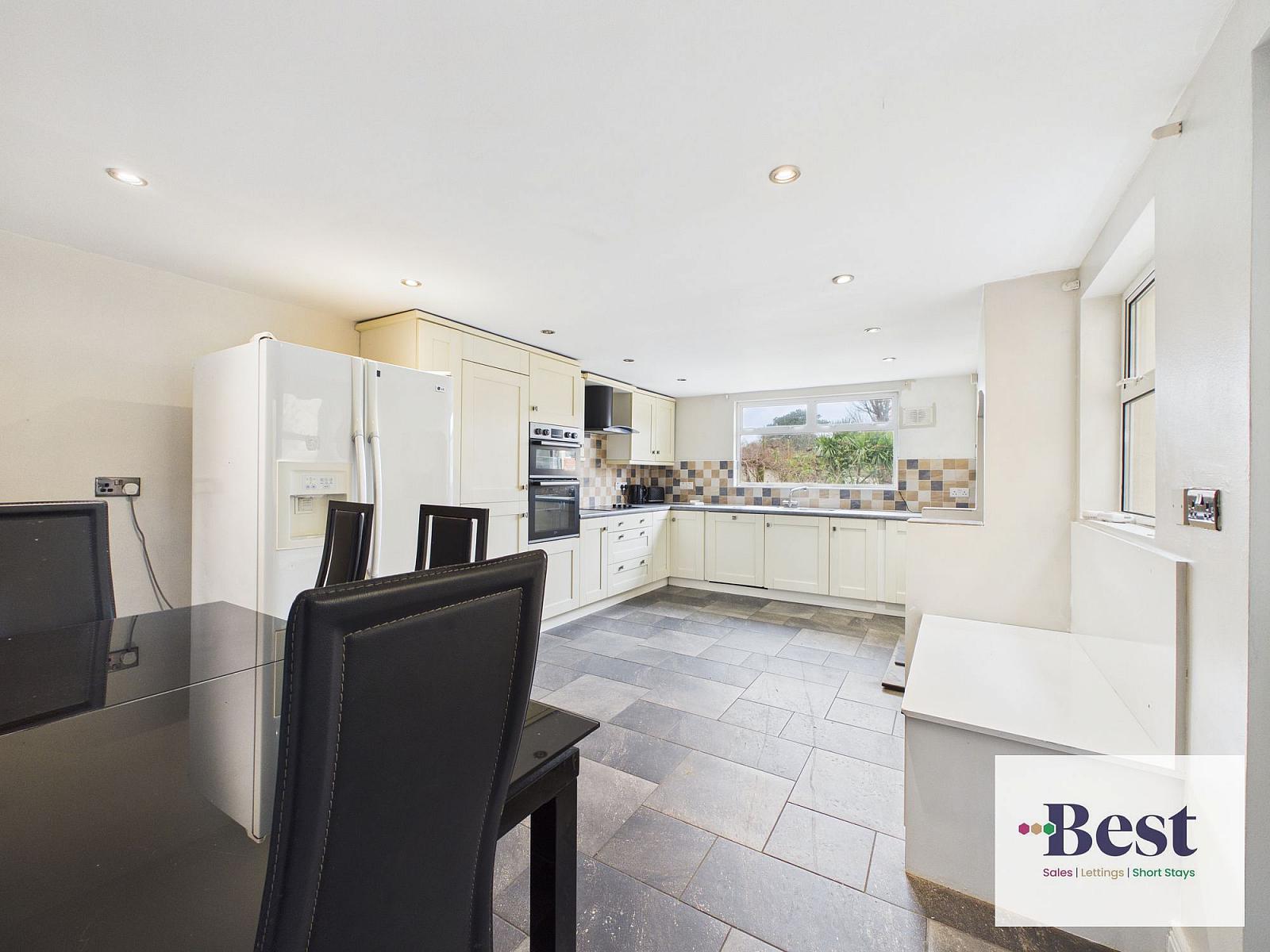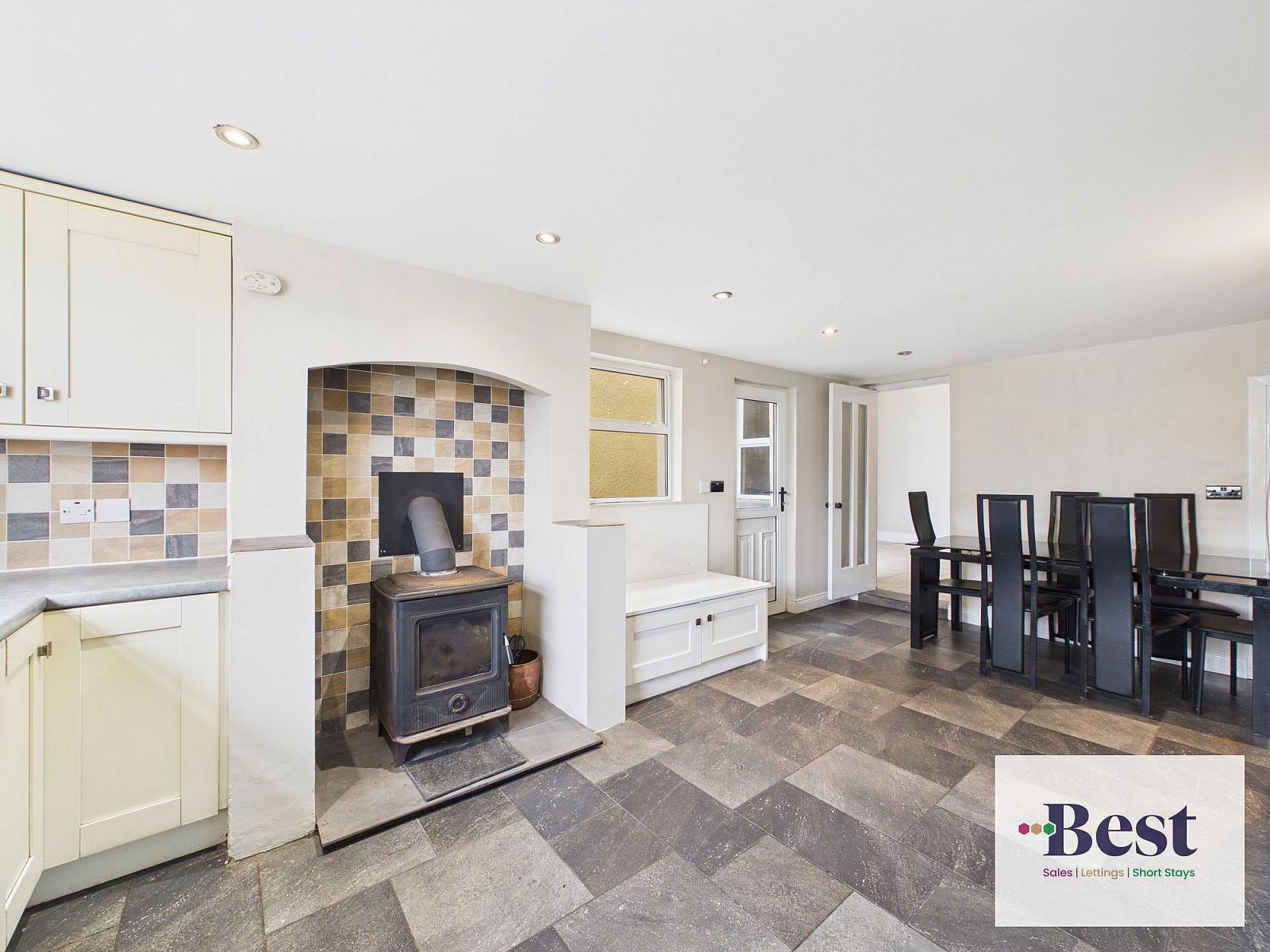 Very spacious kitchen / Dining room with another feature stove. Good range of high and low level cream units with laminate work surfaces. One and half bowl stainless steel sink. Eye level double oven, four ring hob and black extractor over. Integrated Fridge freezer, integrated dishwasher. Pull out larder. Ample space for dining. Built in seating area. Lots of light from dual aspect windows and a glazed side door to the patio. Under stairs storage. Part tiled walls and tiled flooring.