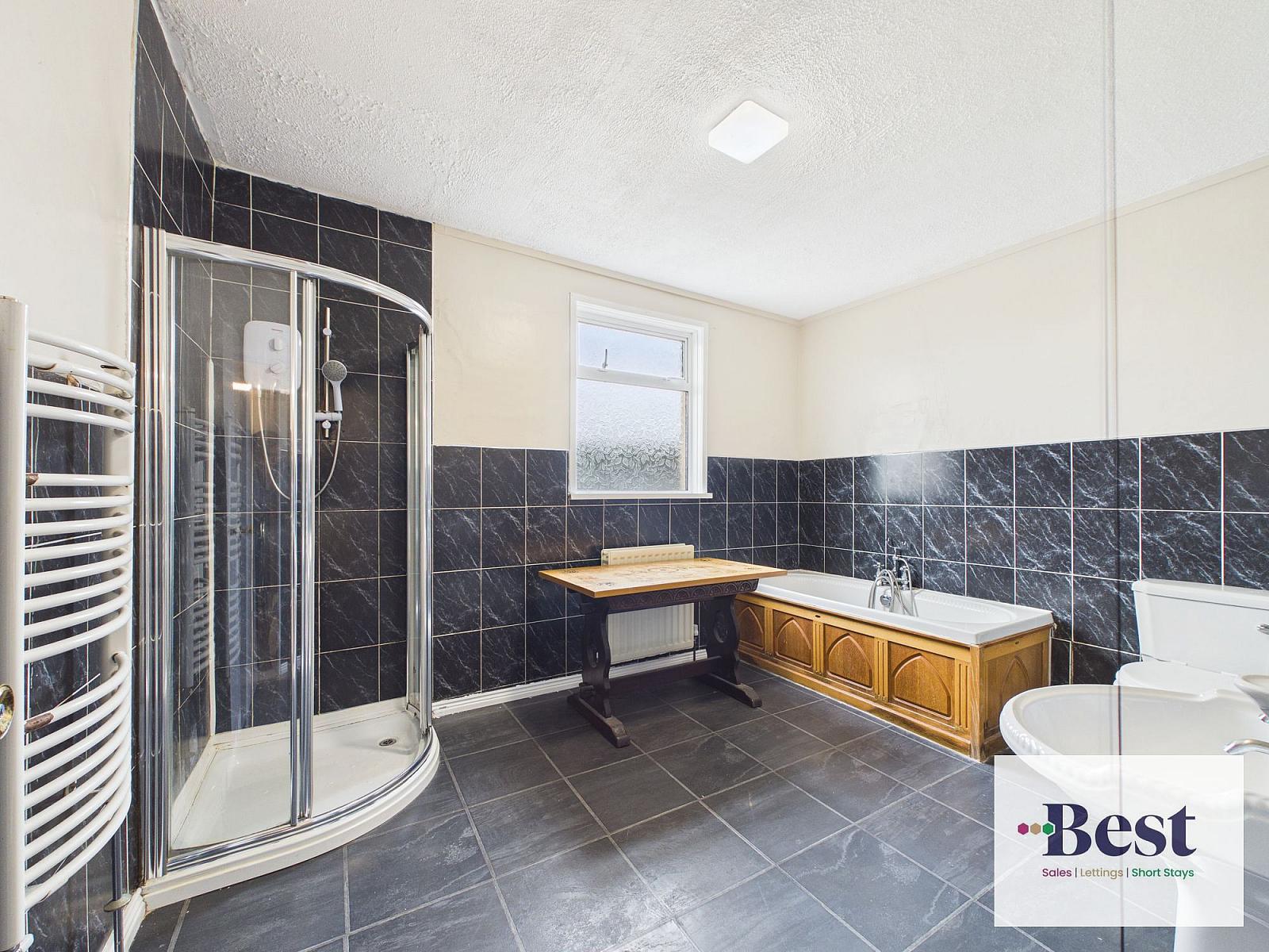 White suite comprising low flush WC, pedestal wash hand basin with chrome taps, attractive panelled bath with mixer tap and telephone shower head. Separate shower quadrant with red ring electric shower. Tiled shower cubicle, part tiled walls and tiled flooring.