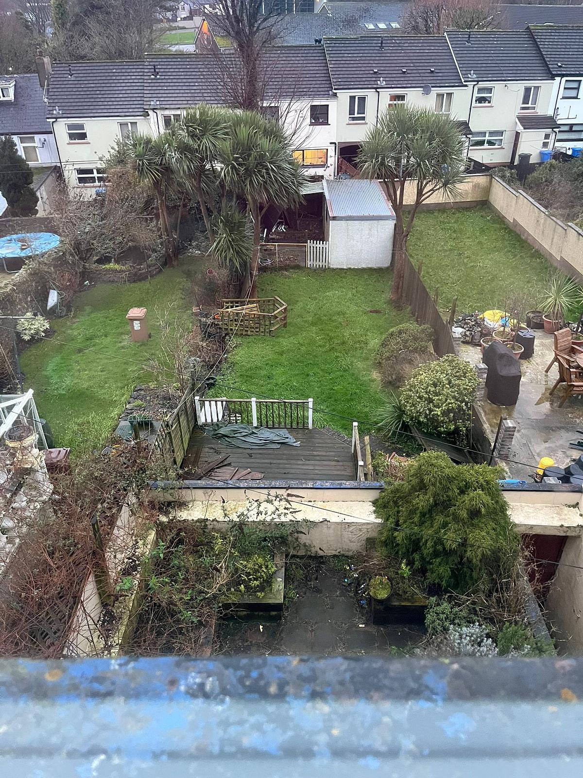 paved area fully enclosed with plant pots and beds. Providing a raised terrace for chilling, eating or entertaining.
